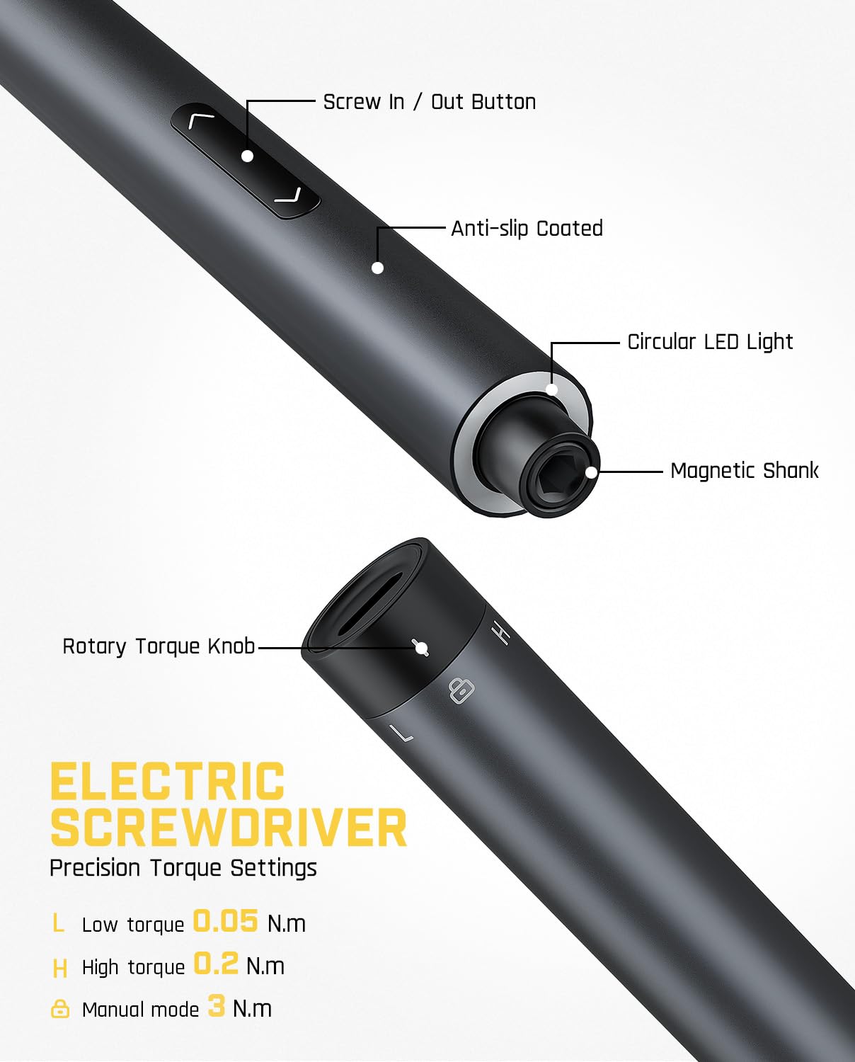 • Robust Efficiency In Half the Working Time: Equipped with an electric precision screwdriver, it takes half the regular time when maintaining your electronic gadgets. With dual torque settings of 0.05 N.m and 0.2 N.m, and a manual gear of up to 3 N.m, the versatility is endless.
