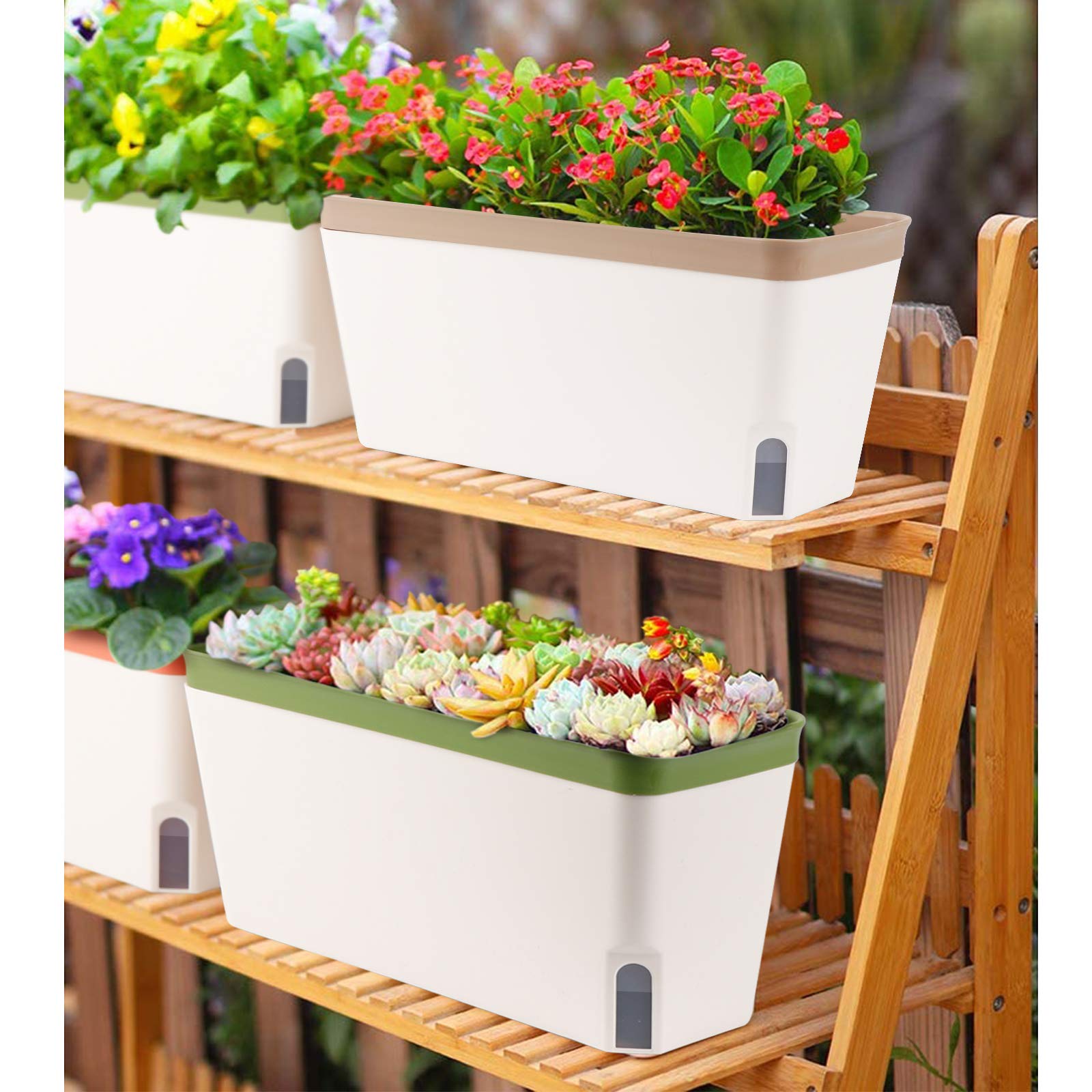 Fayavoo Self Watering Plant Pots, Set of 3 10.5 Inch Rectangular Windowsill Herb Planter Box, Modern Plastic Flower Pots for Indoor Outdoor Garden Office Patio, Planters with Drainage Hole Hidden Tray