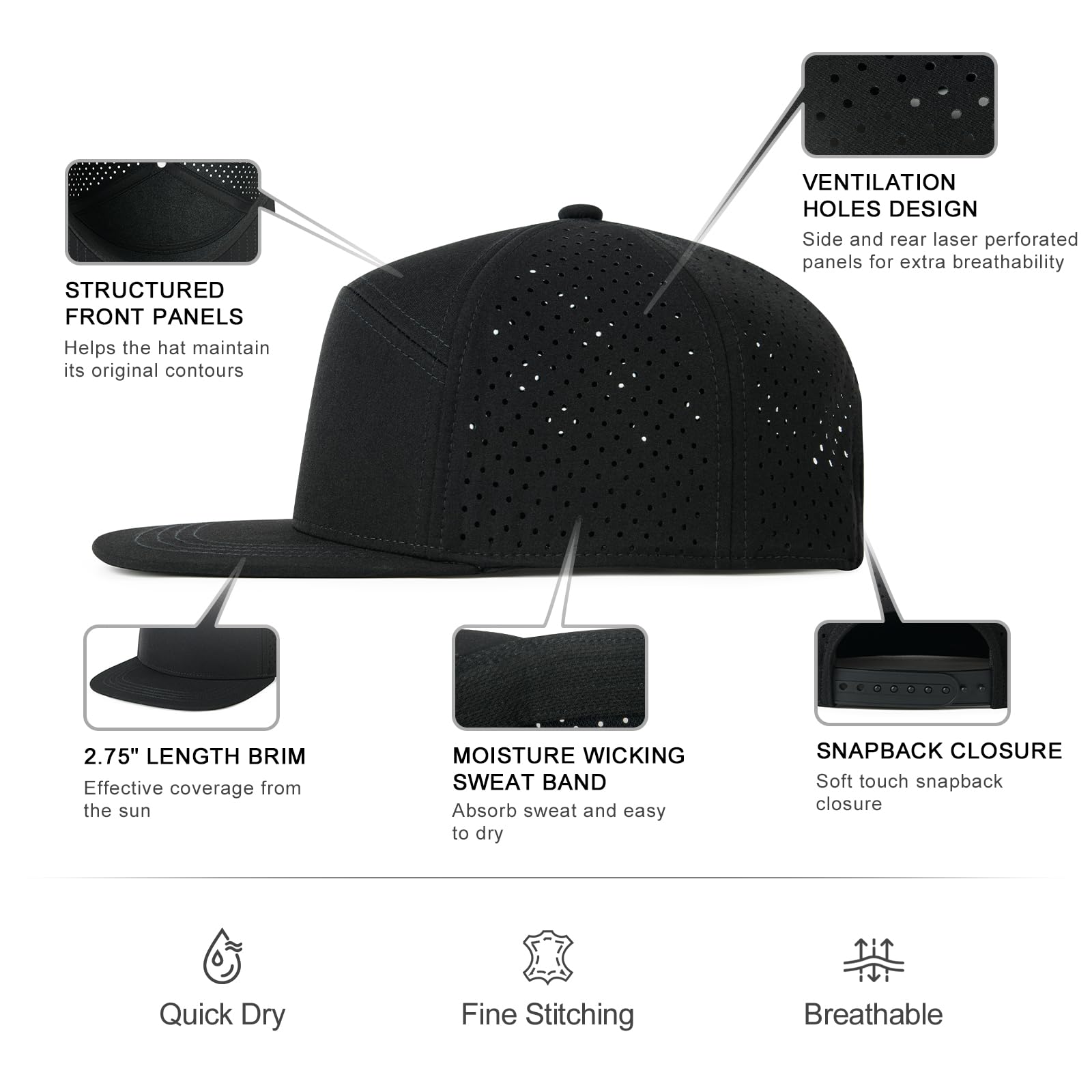 • High Performance: Flat brim to keep out of the sun, structured front panels and mid crown to maintain shape; Laser cut holes ensures your head breathable, classic adjustable snapback closure to let your head fit better