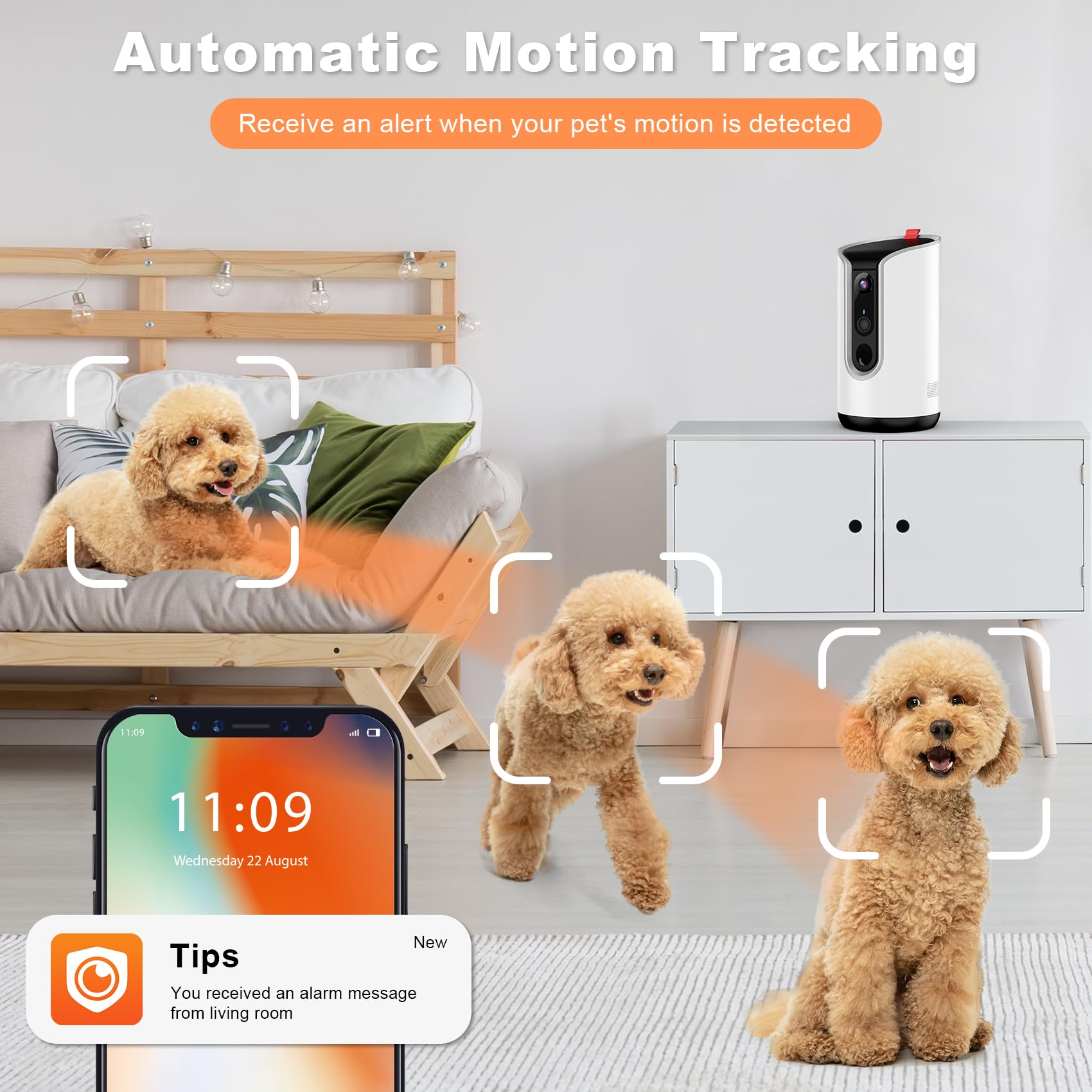 • UPGRADED 360° VIEWING ANGLE: 2K Ultra HD with a 360° horizontal rotation angle helps us say goodbye to blind spots and ensures that every moment of your pet's happy life is captured. This pet camera supports motion, bark sound detection and AI auto-tracking, and the app sends a notification to your phone when an anomaly is detected, so you won't miss any of your pet's important movements.