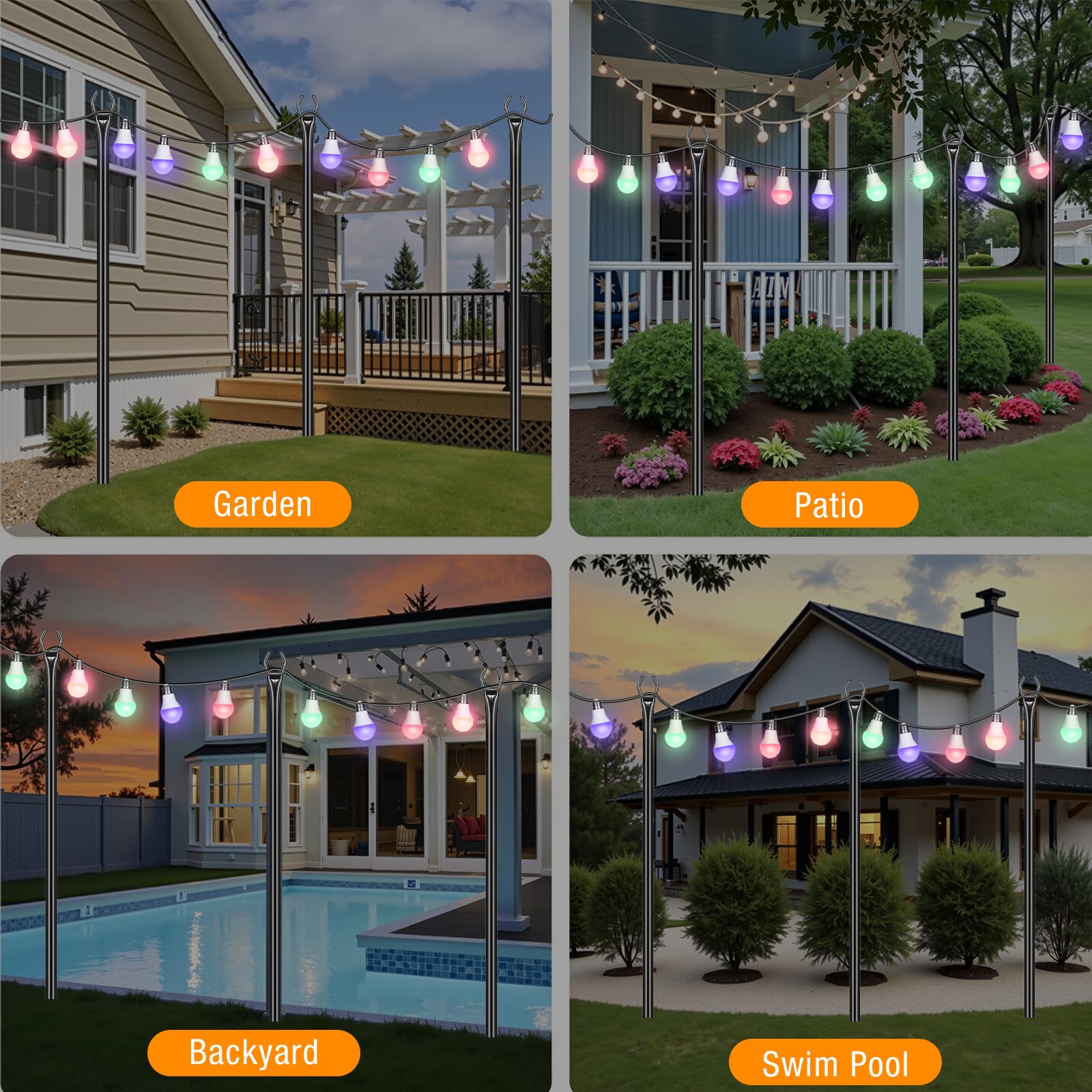 • ✔️【Heavy Duty & Stable Construction】Crafted from rust-resistant carbon steel, our string light poles for outside are engineered for superior durability and long-term outdoor use(Bulb Not Included). Each pole stands firmly with a reinforced fork base that anchors deep into soil or grass, providing optimal stability even in windy conditions. Designed to support heavy string lights, this pole for outdoor string lights is a great solution for enhancing your patio, garden, or backyard atmosphere