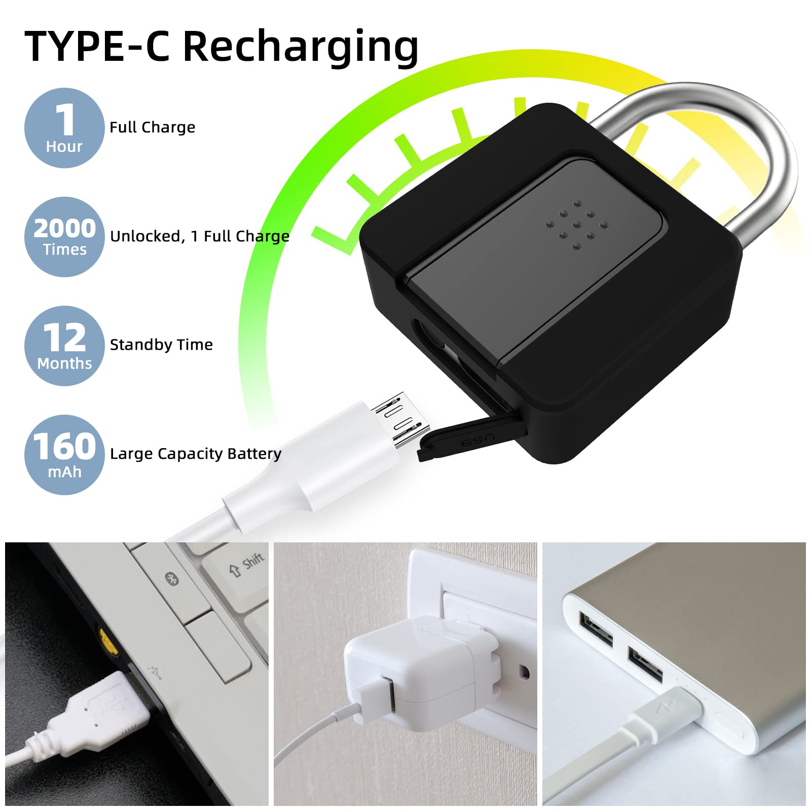 • 【Long Battery Life】Type-C charging port allows for approximately 3000 unlocks on a single charge, sufficient for one year of use. Equipped with a low battery alert, timely reminders through lights, and precise monitoring of battery levels via the smartphone app.