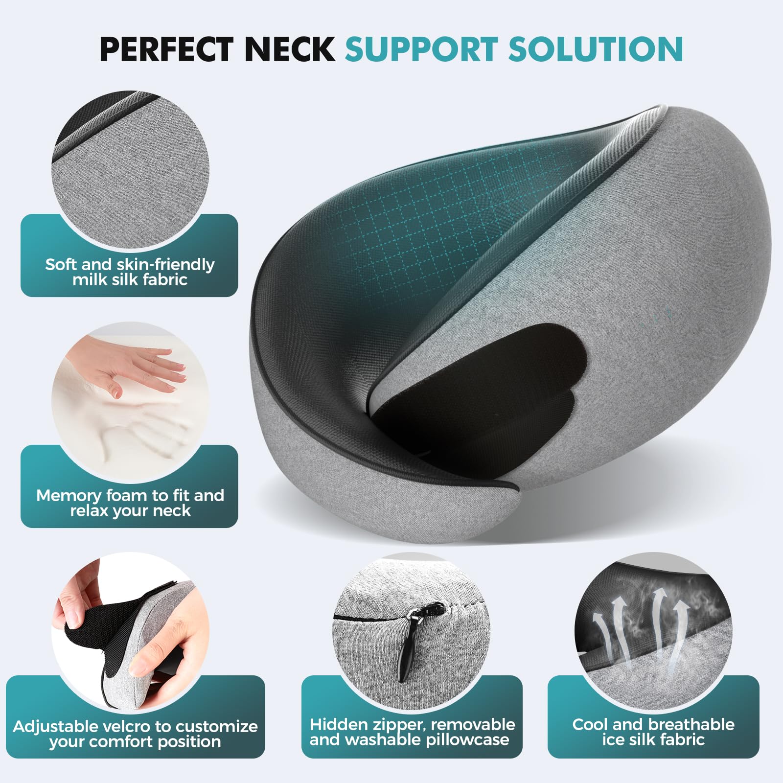FIOGIKO Travel Neck Pillows for Airplanes, 360° Ergonomic Memory Foam Travel Pillow - Relief Neck Pain with Breathable Support for Long Flights, Car, Train & Office Use - Adults & Kids