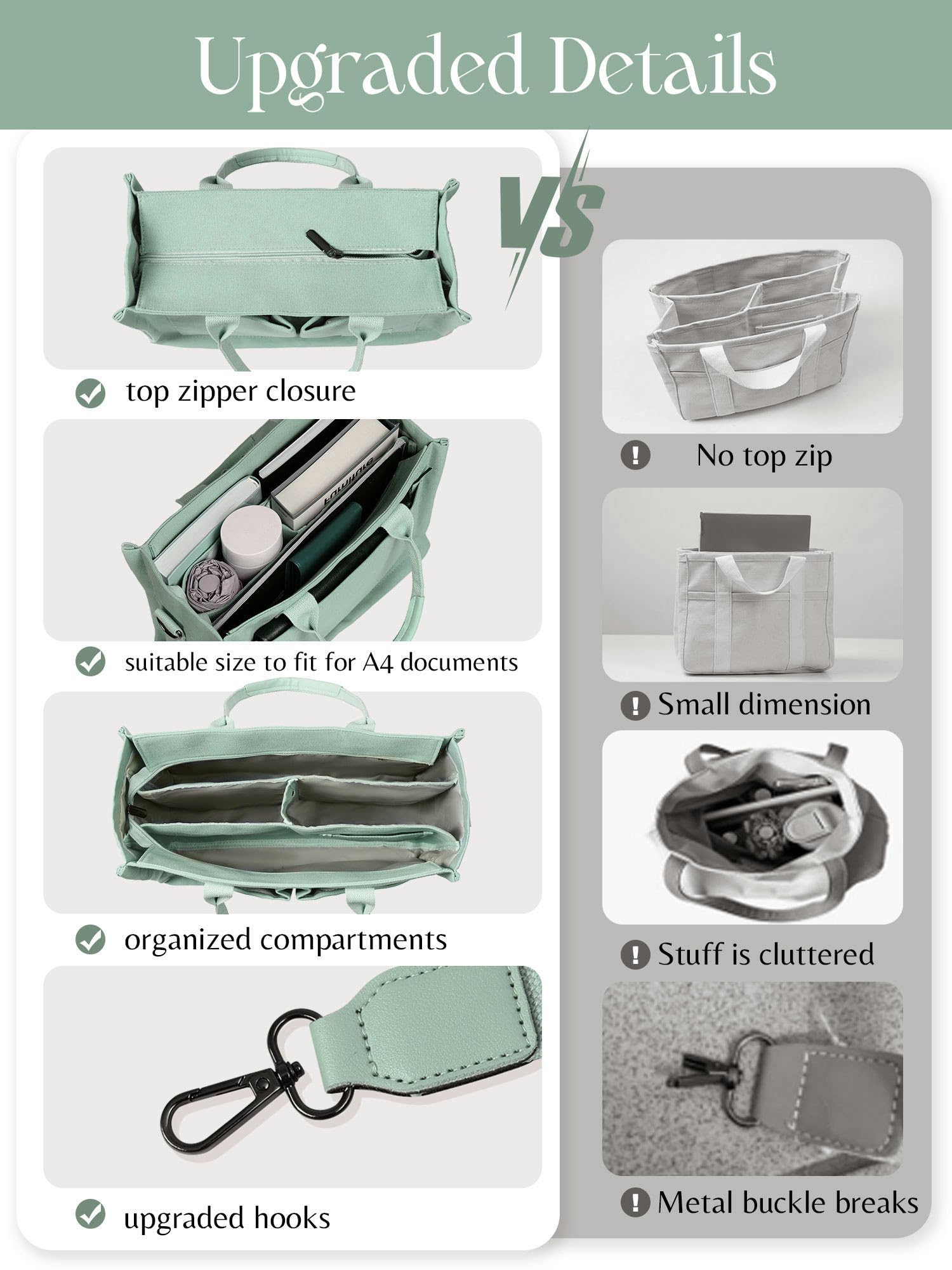 • Top Zipper Closure & Thick Bottom Support: the work tote bag is designed with top zipper to keep your belongings safe and secure. Besides, the reinforced thick bottom provides stability and can easily hold heavier items without losing its shape