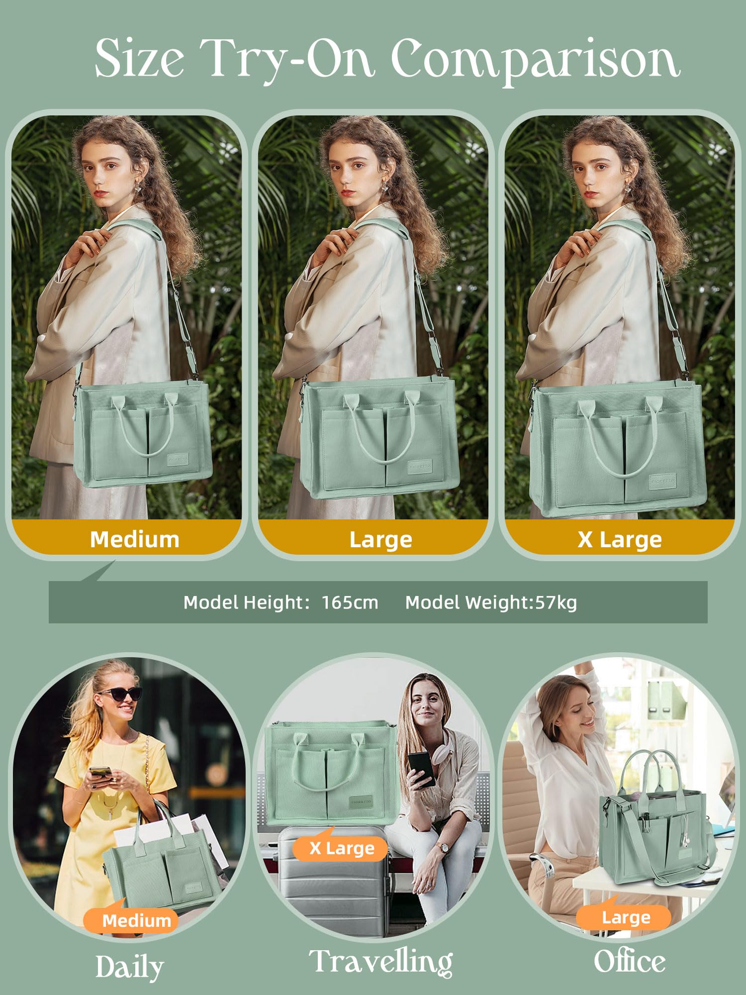 FIORETTO Canvas Tote Bag for Women with Zipper Closure & Individual Compartments for Work College, Crossbody Laptop Tote Purse Handbag with Detachable Strap & Bottom Support for Teacher & Nurse Green