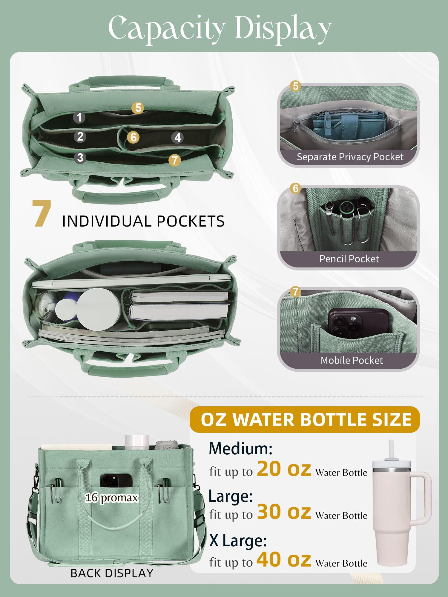 • 2 sizes available: This tote bag for women of M Size is 13'L×6'W×9.8'H and can hold 13' laptop & 24 oz mug, suitable for work and college; L Size is 15'L×7.3'W×10.8'H, which can hold 15.6' laptop, 40 oz mug and other items for your shop or travel