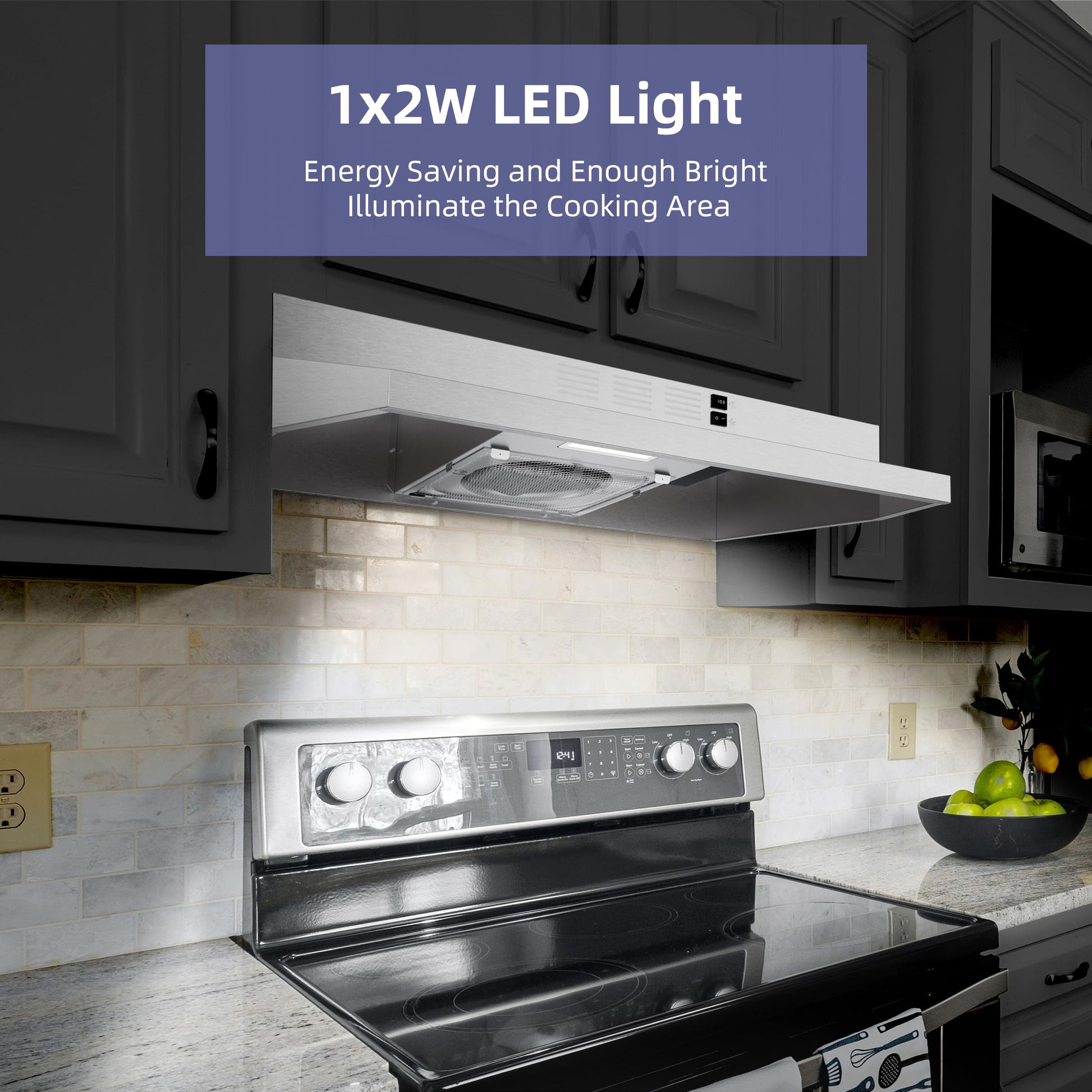 • EASY OPERATION VENT HOOD: Rocker button control, simple operate. Easy to turn on and off,Low/ High Speed button suitable for different cooking method.2W LED offer enough brightness to meet your cooking need.Quiet operation keeps noise level less than 57dB at high speed.