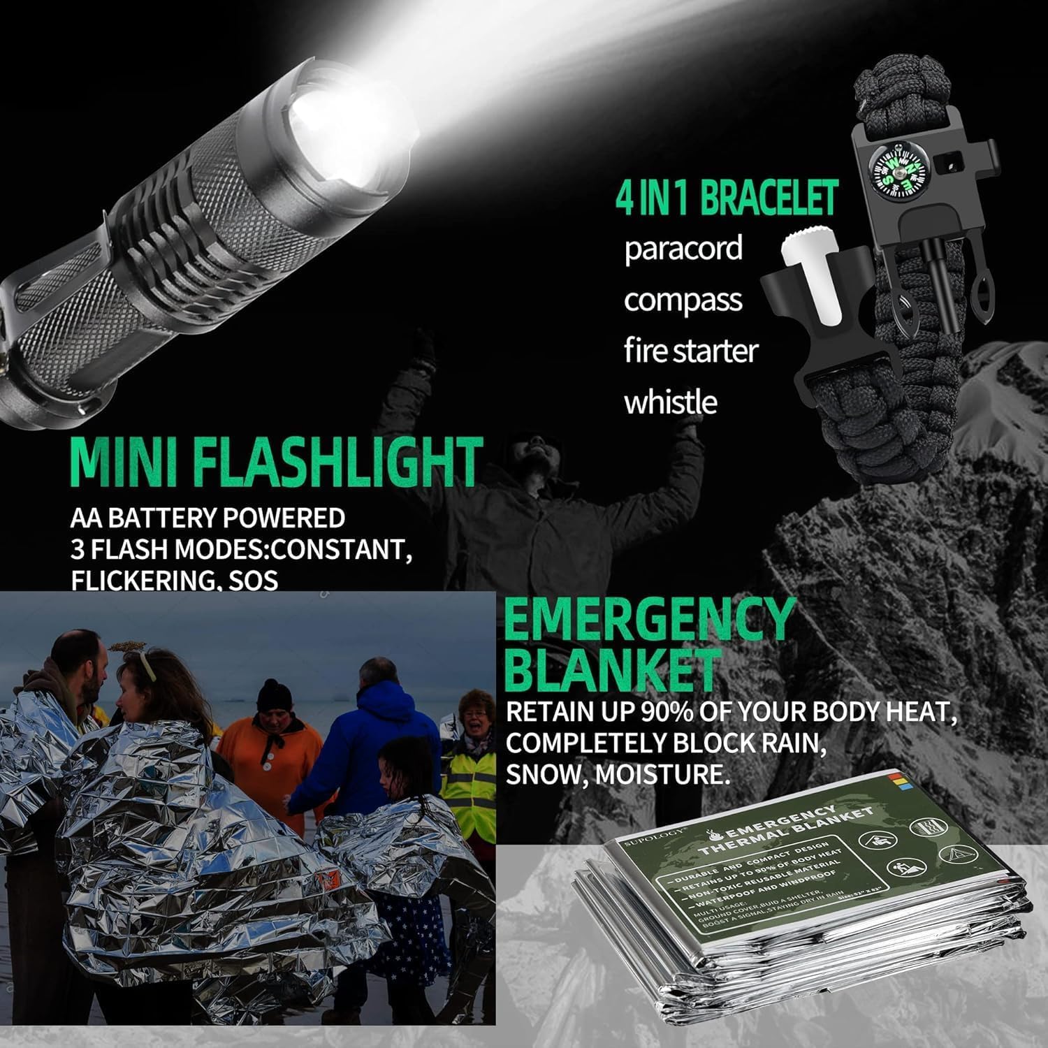 • ➤Professional Camping Kits – Get what your need in camping and other emergencies. This kit Includes: multi-function bracelet, fire starter, emergency blanket, flashlight(need AA battery), glow stick, 125 pcs first aid Kit, Tourniquet and fast bandage. All items can put in the upgrade bag.