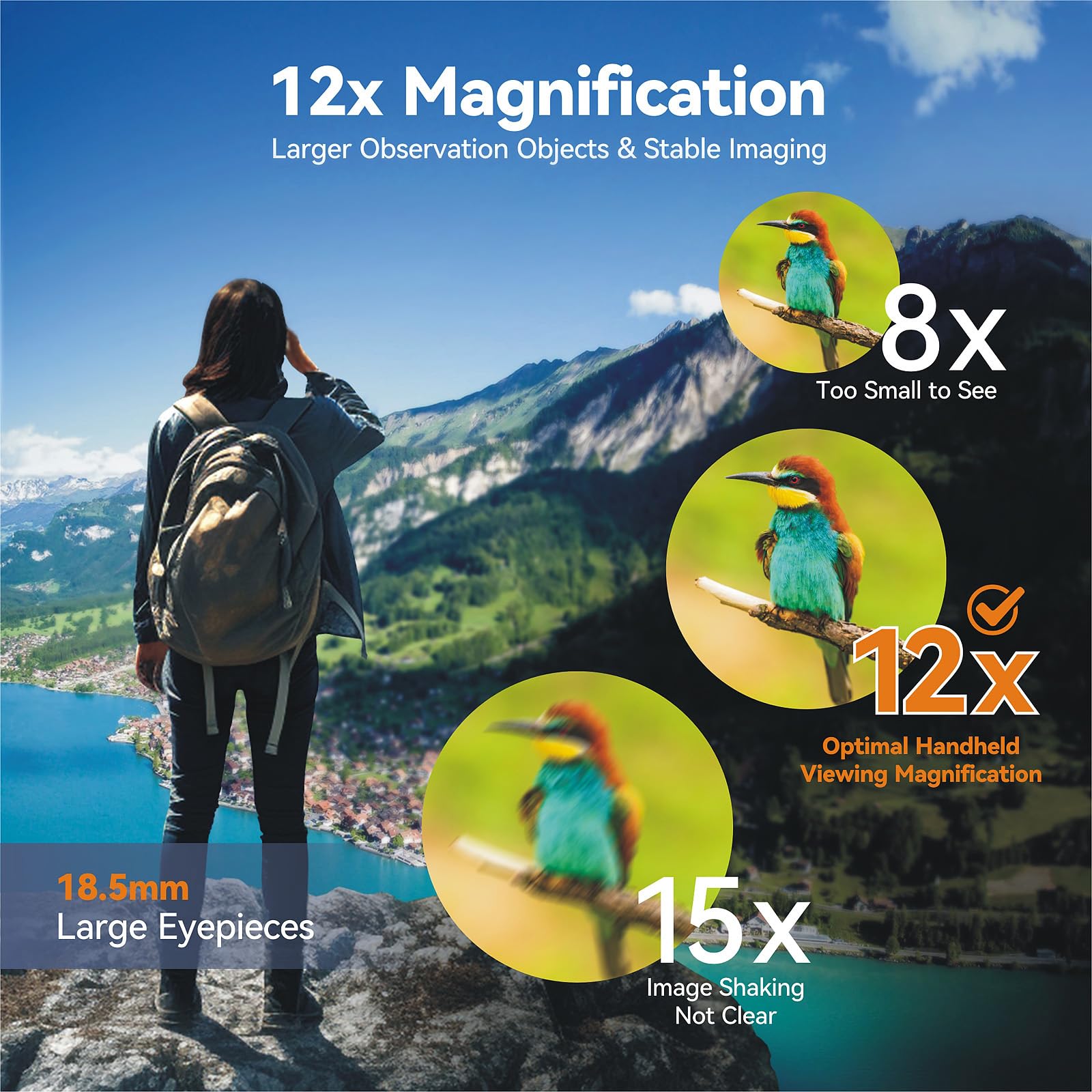 • Unlock Nature's Hidden Details: You're 650 feet from a rare ivory-billed woodpecker - its black-and-white wings flicker through dense foliage. Featuring 12x magnification and upgraded 14.5 Platinum BAK4 prism system, these binoculars for adults enhance clarity in dim forests while FMC-coated lenses eliminate harsh glare. Never miss a moment: bird territorial disputes, Alaska cruise whale sightings, or your child's first awestruck 'I see the eagle!' gasp. Optics so vivid, they feel like nature's best-kept secret