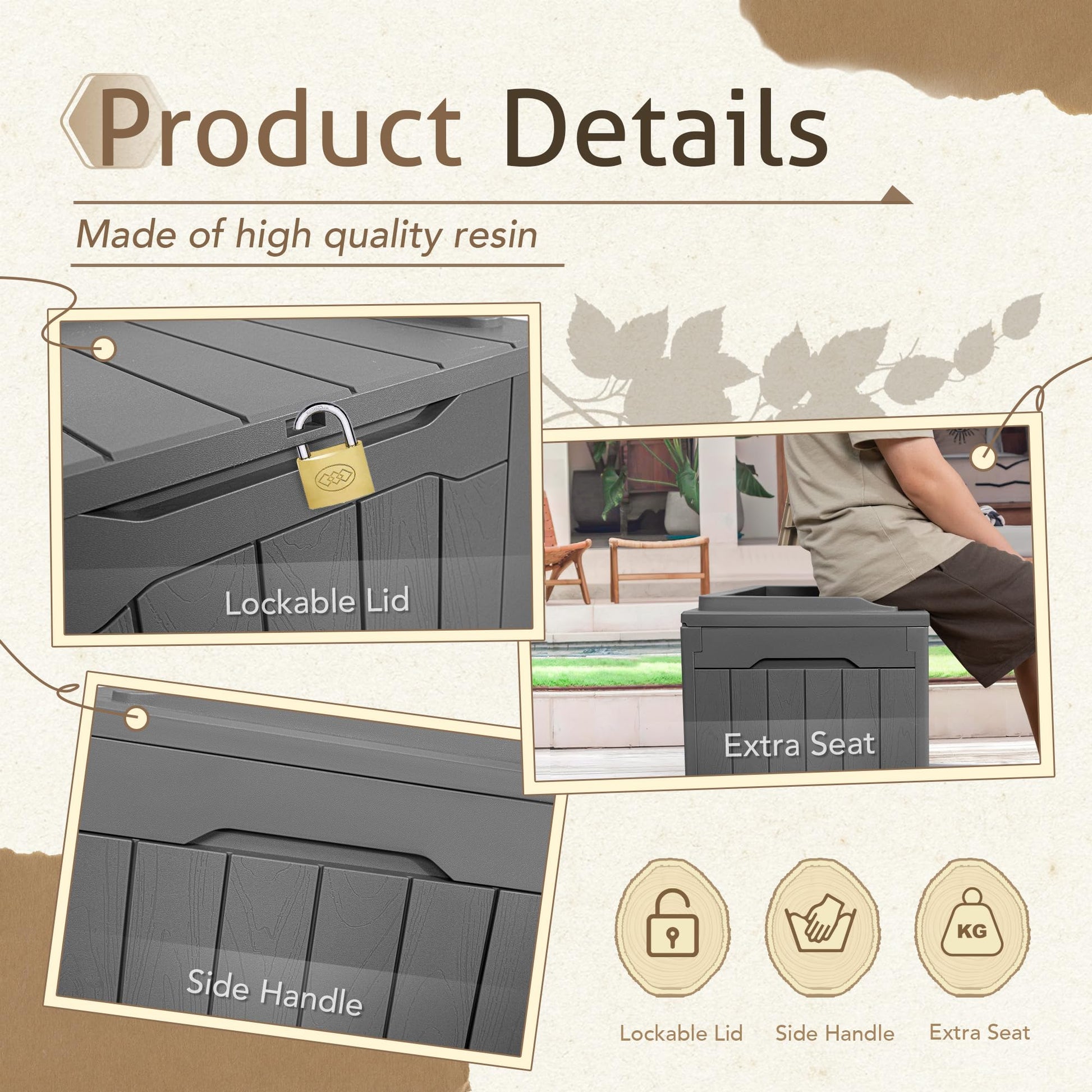 • All-Weather Material: Deck box is made of high quality Resin & Polypropylene, featured with waterproof and UV resistant which protects its exterior from fading and keeps its interior dry. Can adapt to long time outdoor scene.