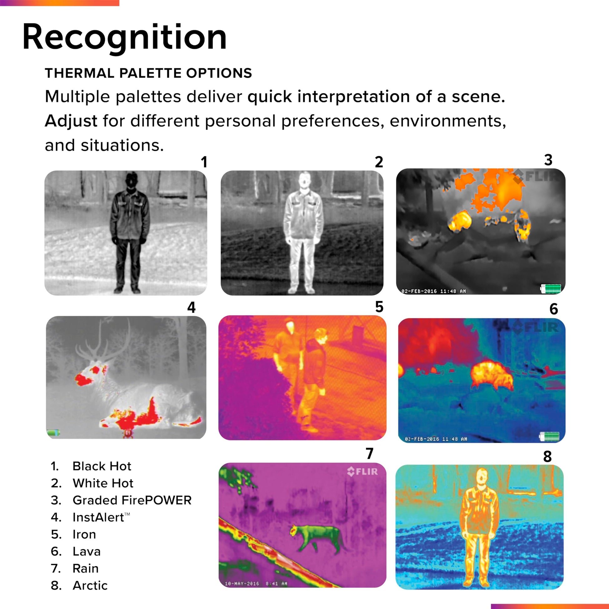 HIGH CONTRAST IMAGES - Choose between white hot, red hot, instant alert, Rainbow, Iron, Lava, Color Wheel or Graded Fire 1&2 views