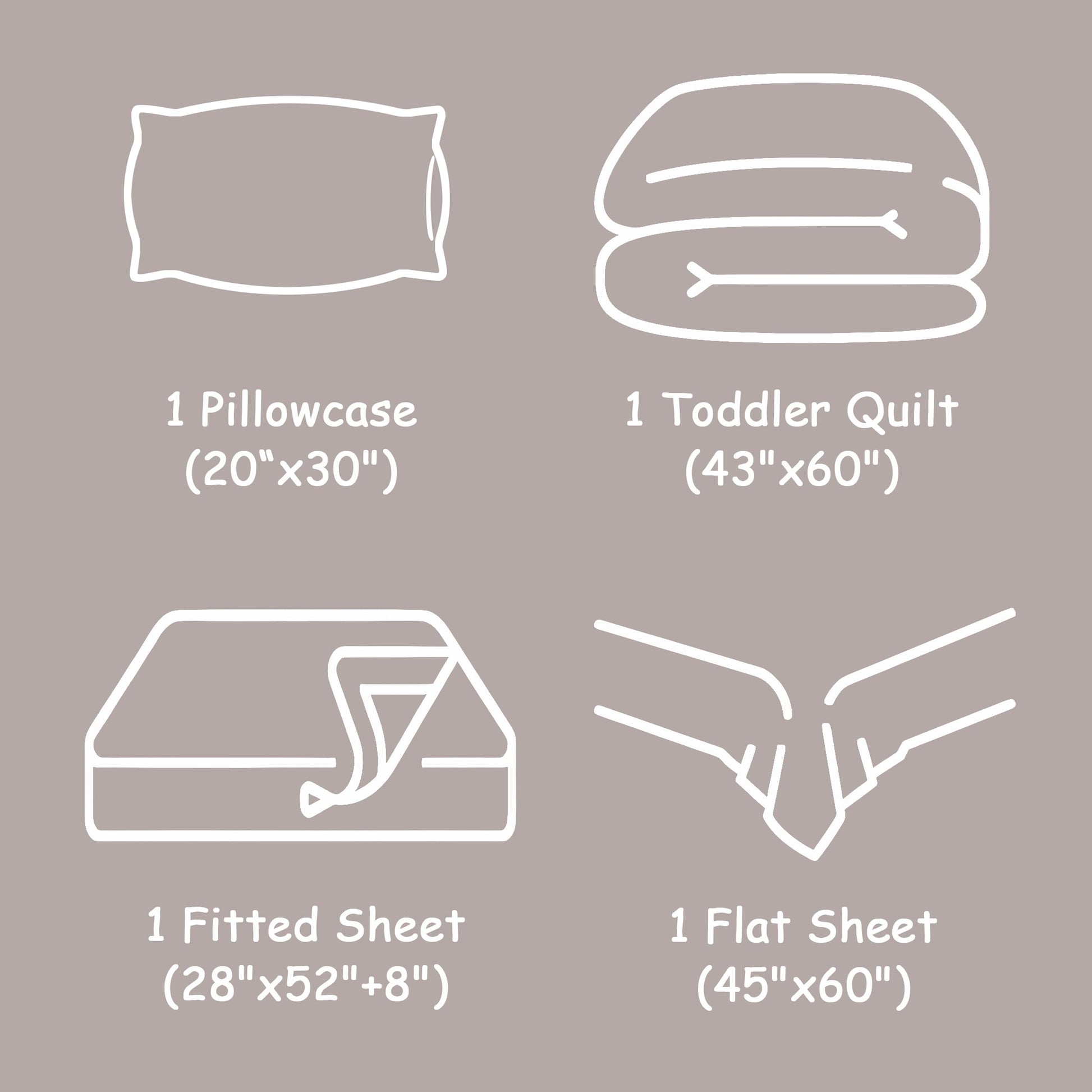 • Package Include: 1 Toddler Quilt(43x60 inches), 1 Fitted Sheet(28x52+8 inches), 1 Flat Sheet(45x60 inches), 1 Pillowcase(20x30inches) (Pillows are not included.)