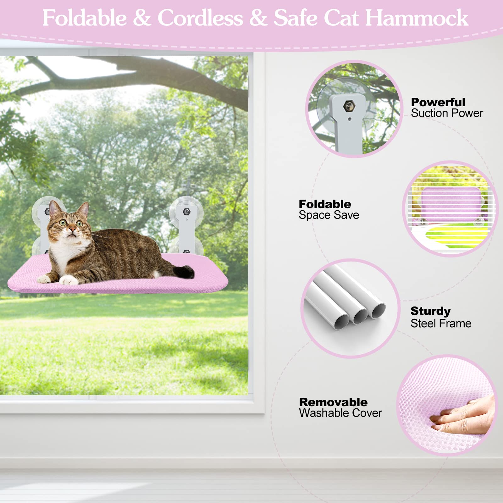 Foldable Cat Window Perch, Cordless Cats Window Hammock Window Bed for Indoor, Large Window Seat Sill Cat Perch, Strong Suction Cup & Sturdy Metal Frame & Breathable Mat