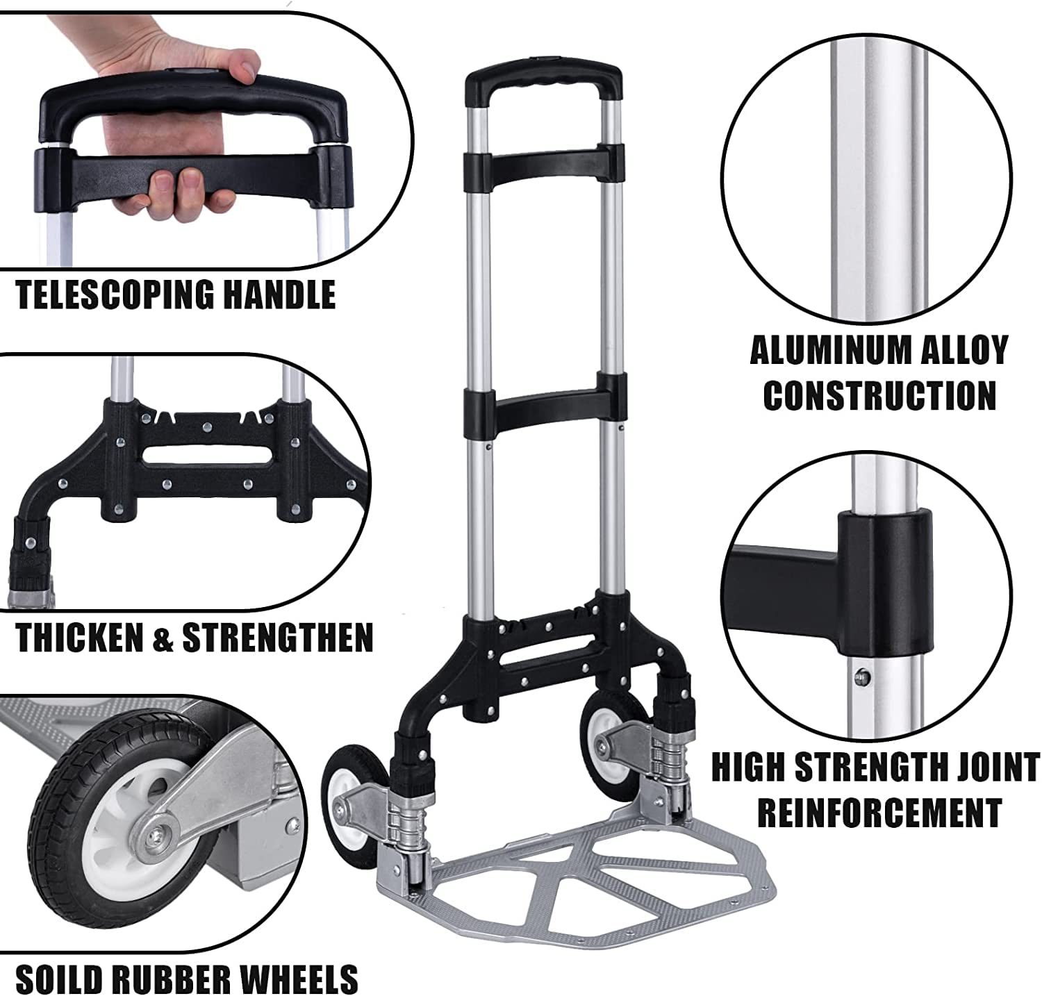 Folding Hand Truck Dolly Aluminum Folding Hand Cart Luggage Trolley Cart Max 175lbs Capacity Dolly Cart, with Telescoping Handle and Rubber Wheels, Double Bearings