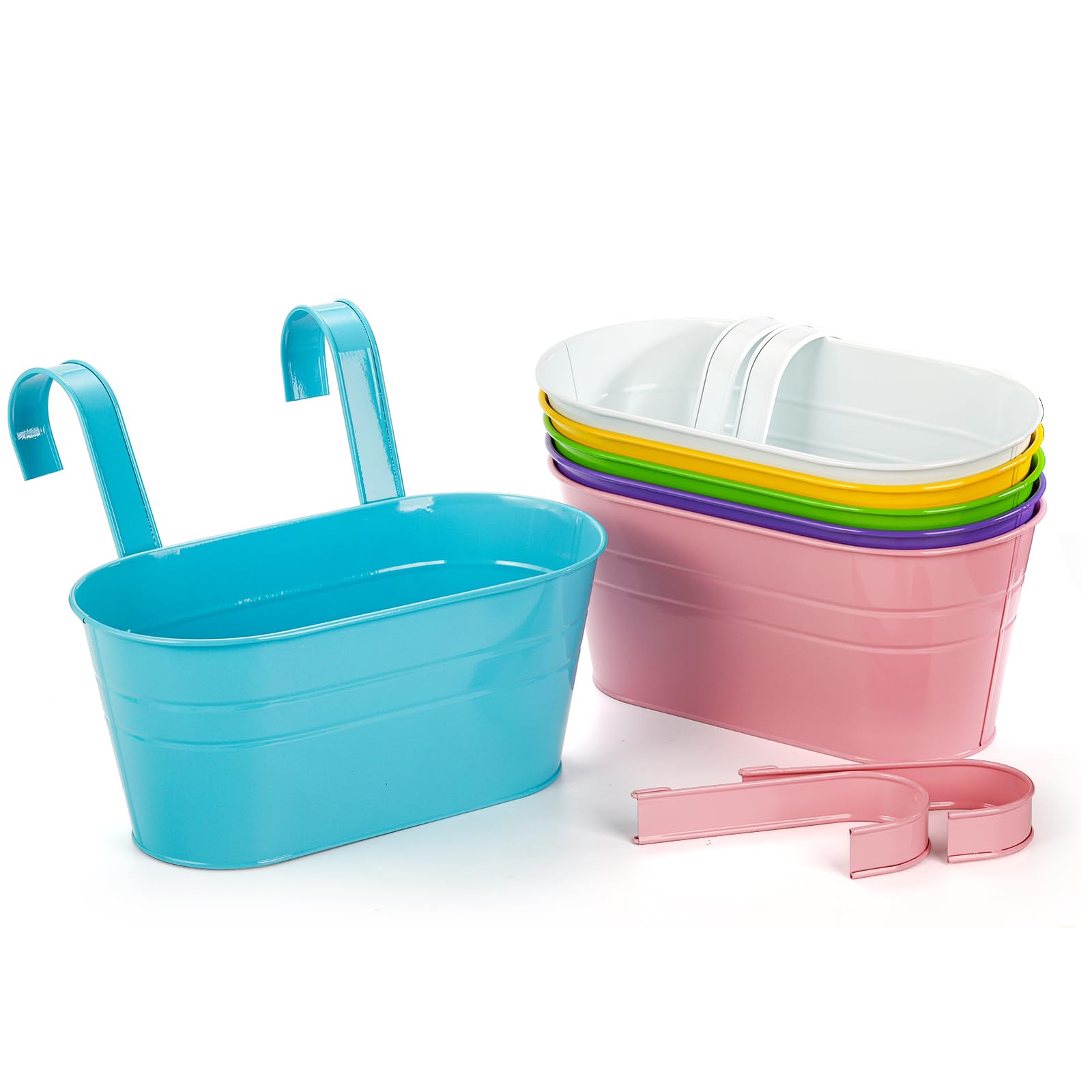 Foraineam 6 Pack Hanging Flower Pots, Metal Iron Plant Pot Holders, Garden Pots Balcony Planters, Metal Bucket Flower Holders Wall Hanging Decor Pot with Detachable Hooks for Railing Fence Balcony