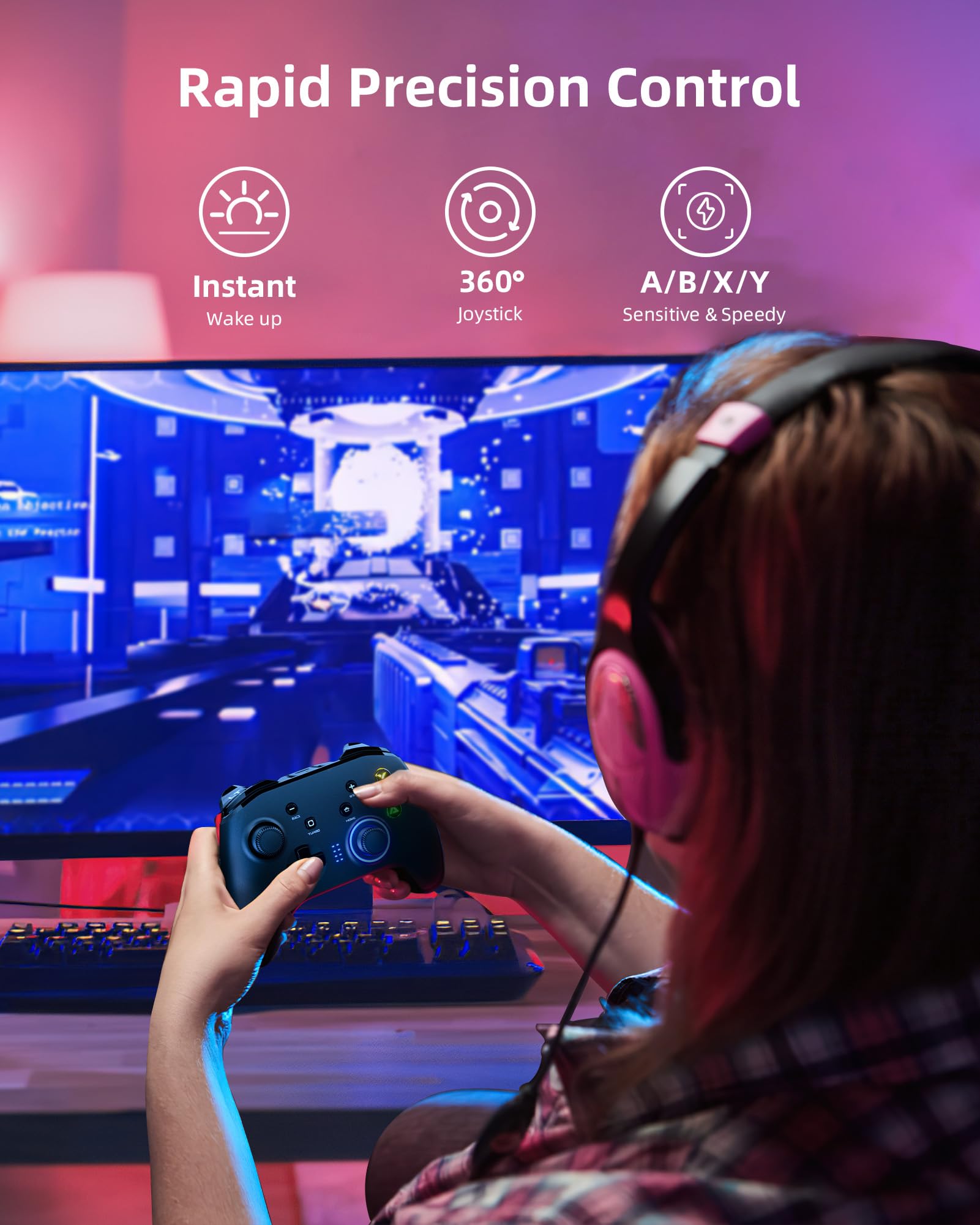 • 【Wireless & Wired Mode】: This is the most fantastic feature of this product. Once you are out of battery but are still willing to play, plug in the USB cable to connect the controller and game device, and switch to wired mode. Happy gaming!
