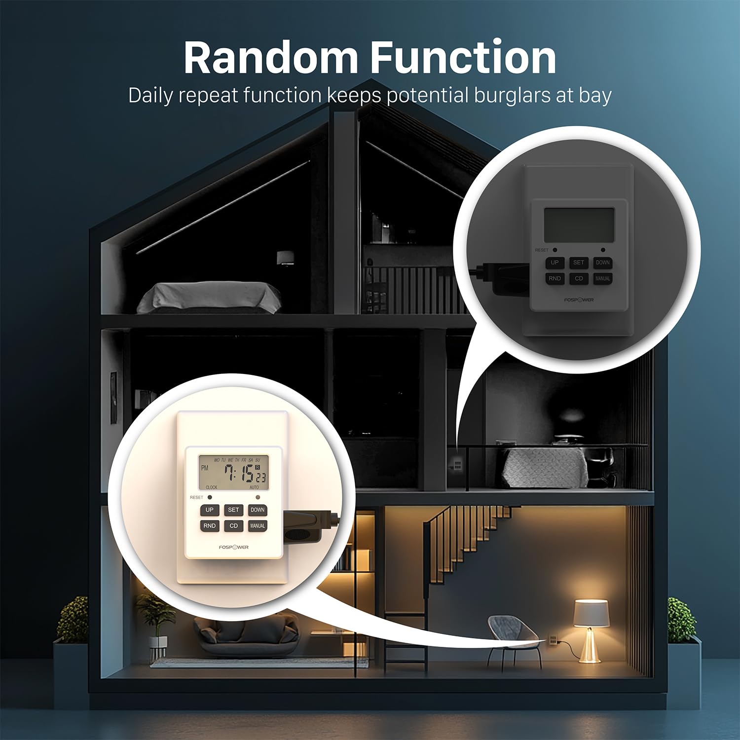 • [FULL CUSTOMIZABLE ] FosPower's digital outlet timer gives you total control over when and how your lights or fixtures turn on and off. The plug in timers for electrical outlets include multiple daily and weekly pre-programmed time settings, full-time customization, and a random setting to keep your home efficient and safe.