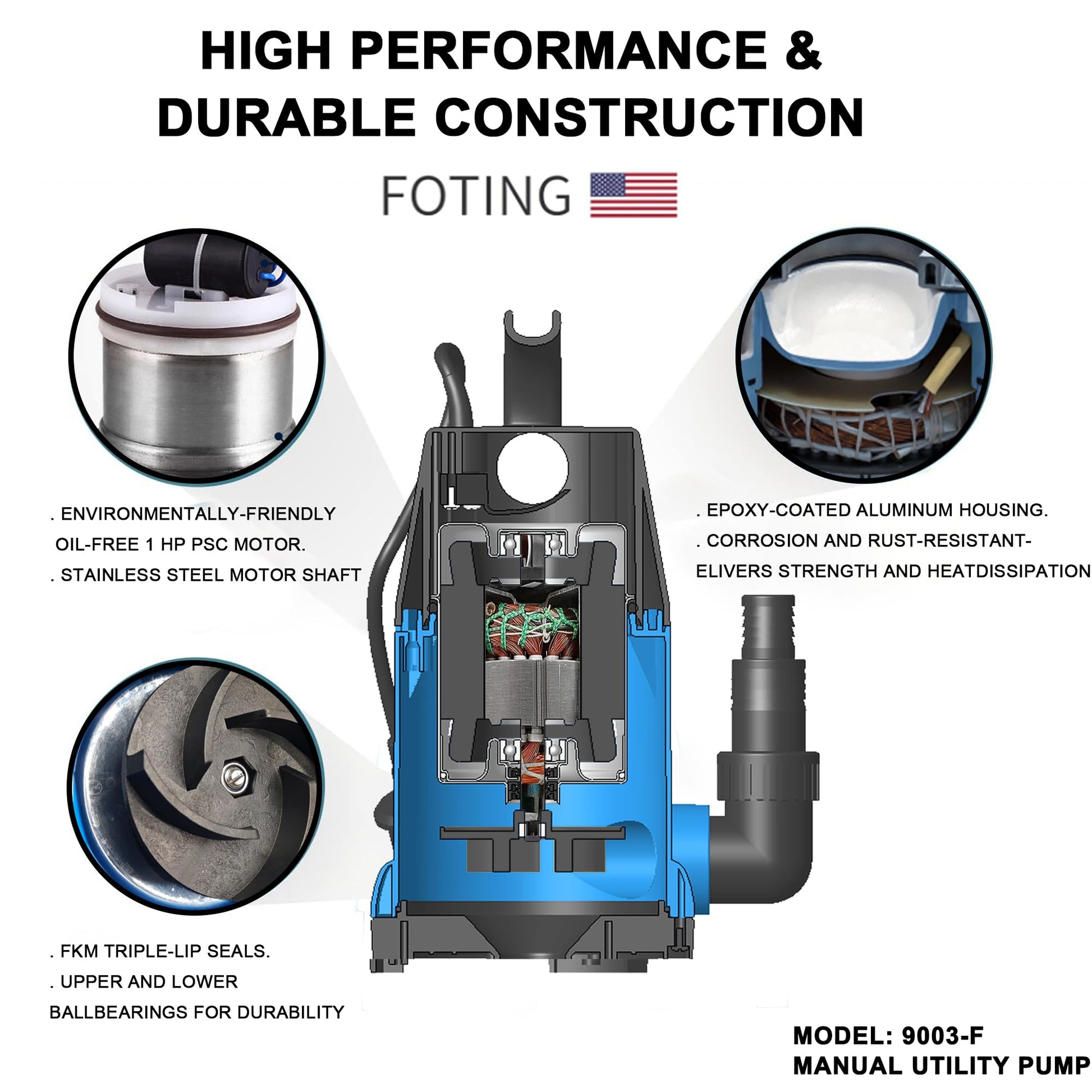 FOTING Sump Pump 1HP Clean/Dirty Submersible Water Pump, 4600GPH Utility Pump Thermoplastic Electric Portable Transfer Water Pump for Swimming Pool Garden Pond Basement with 10ft Long Power Cord