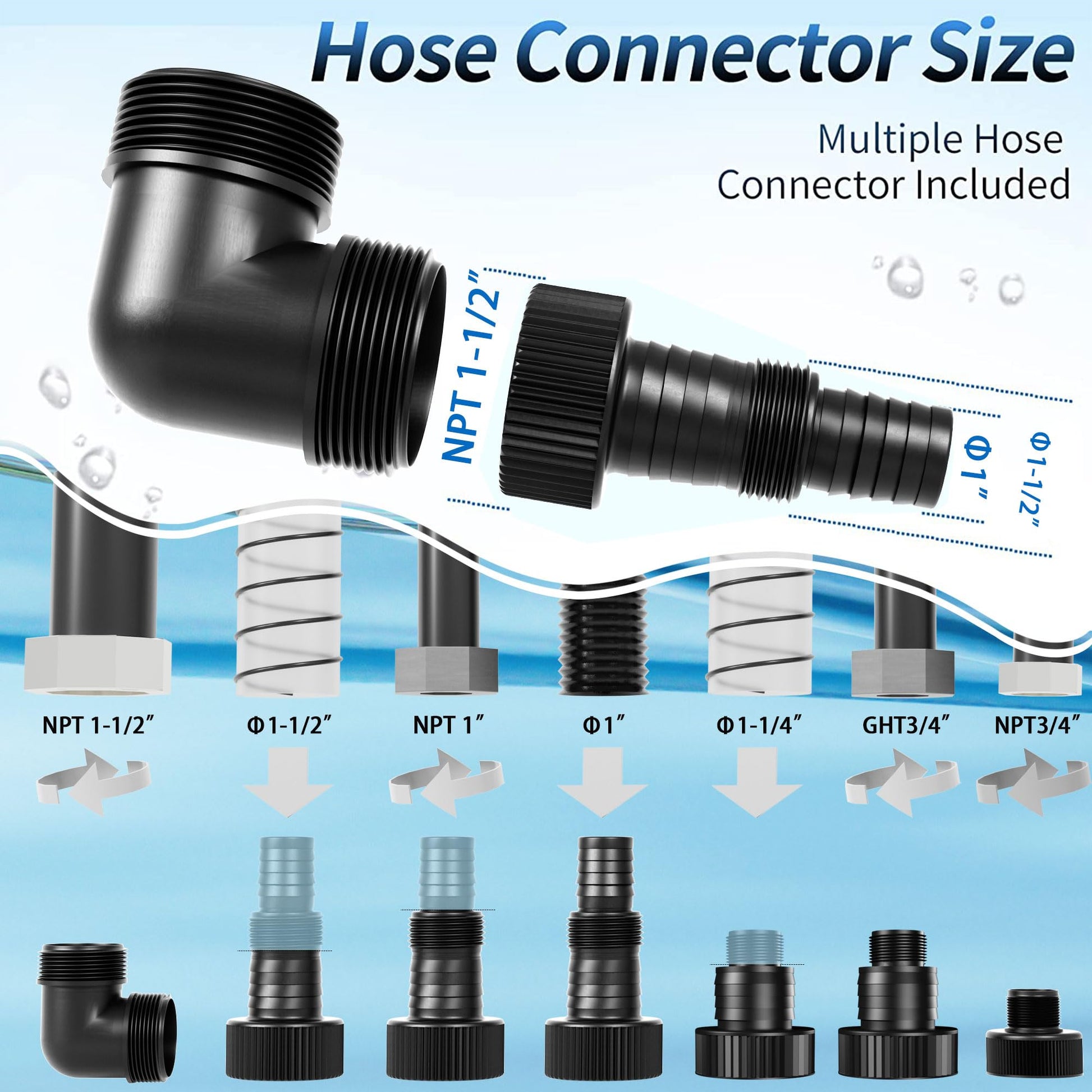 • QUICK TO CONNECT: Comes with a NPT 1-1/2' discharge size, a NPT 3/4' garden hose adapter and a hose adapter fits Ф1-1/2', Ф1' or NPT 1' inch hose. You can use different sizes of hoses depending on the flow