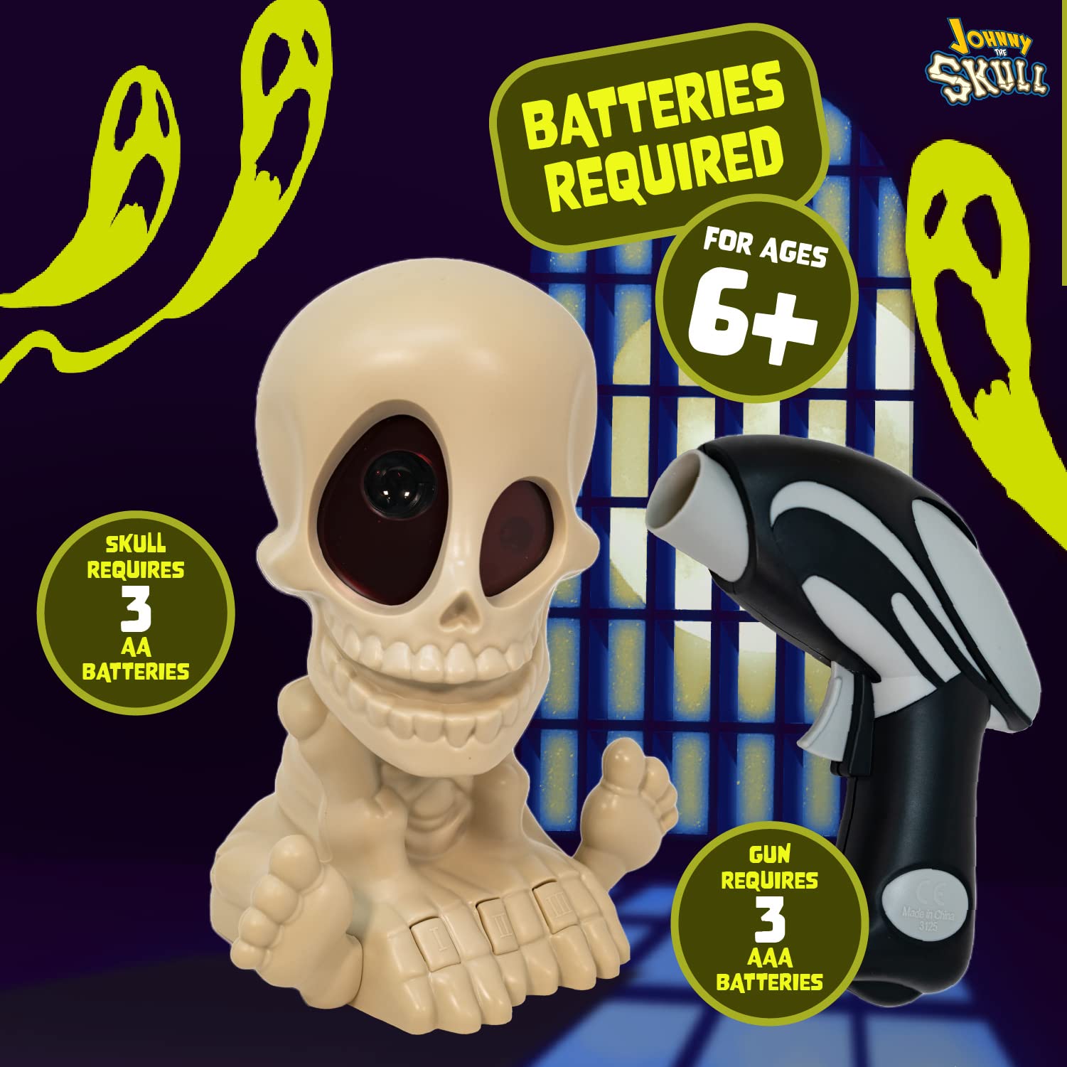 • INCLUDES: Johnny the Skull includes one PROJECTING SKULL and one GHOST BLASTER. Requires 3 AAA and 3AA Batteries. (Not Included)