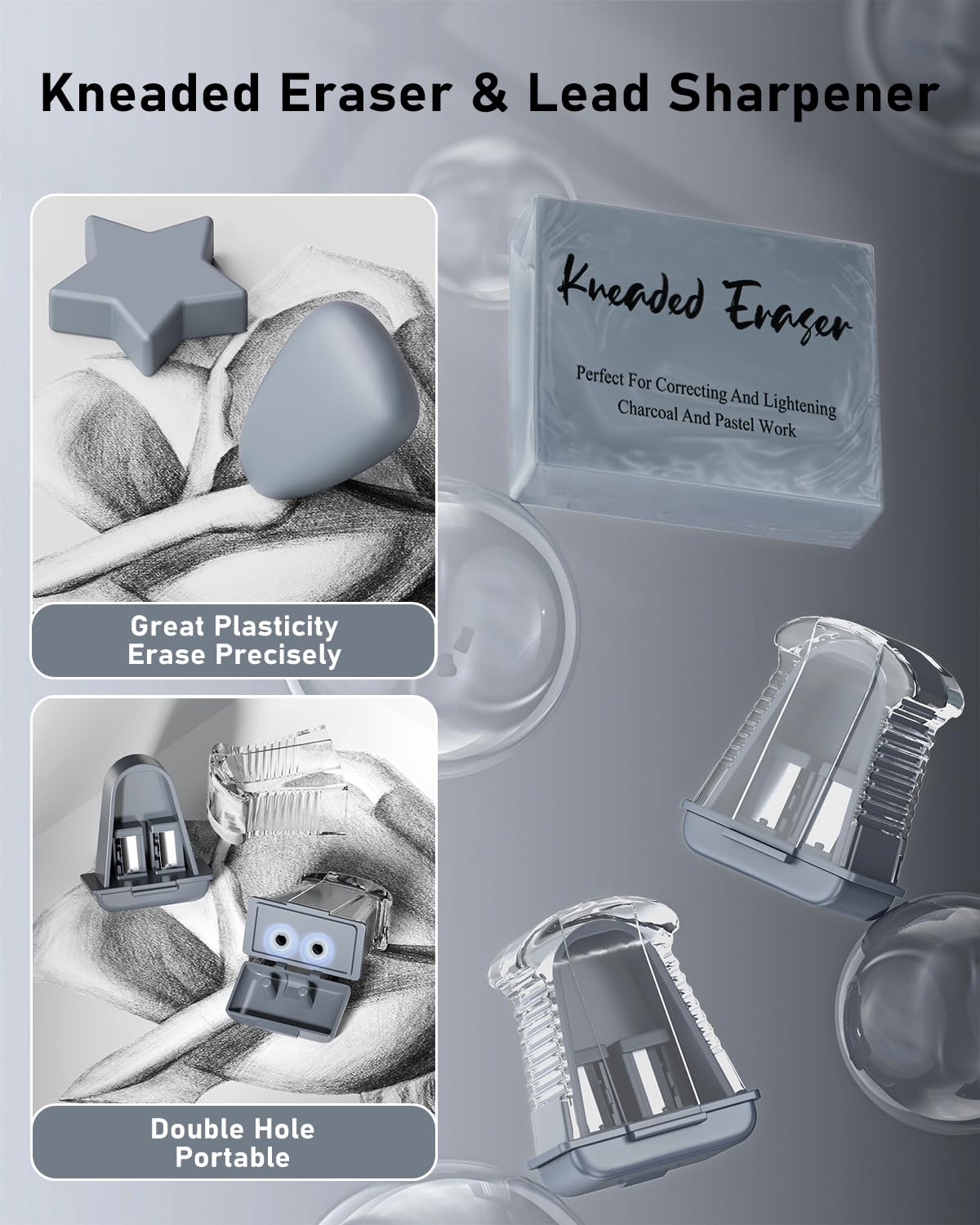 • 【Kneaded Eraser&Sharpener】Includes a kneaded eraser and a sharpener built into the cap of a 2.0mm lead holder, Two extra lead sharpeners are provided for 2.0mm leads to keep them fine when they become dull. The kneaded eraser is ideal for cleaning and blending charcoal, pencils in drawings.