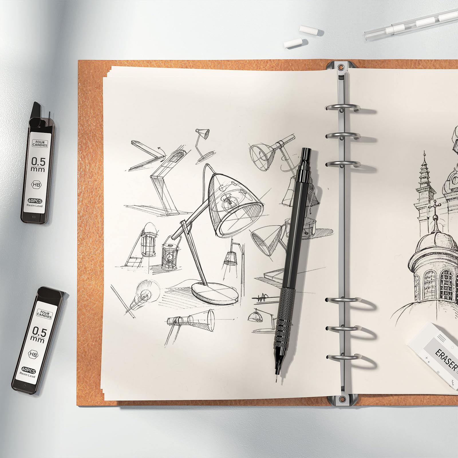 Four Candies 4PCS Metal Mechanical Pencils Set with Case, 0.5mm & 0.7 mm Artist Pencil with 8 Tubes (480PCS) HB Lead Refills, 3 Erasers,9 Eraser Refills For Writing Drafting, Drawing, Black&Silver