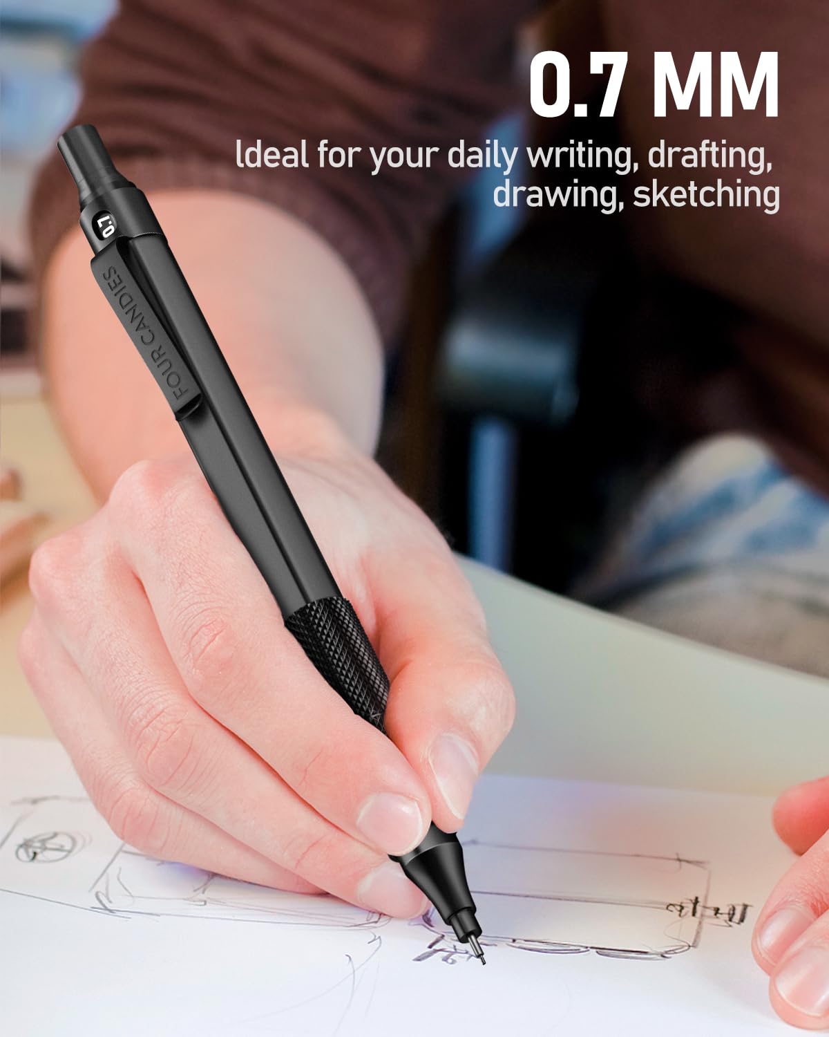 Four Candies Mechanical Graphite Pencil Set, 3pcs Black Metal Pencils with Anti-Skid Grip, Ideal for Artists, Professionals, Teachers and Students