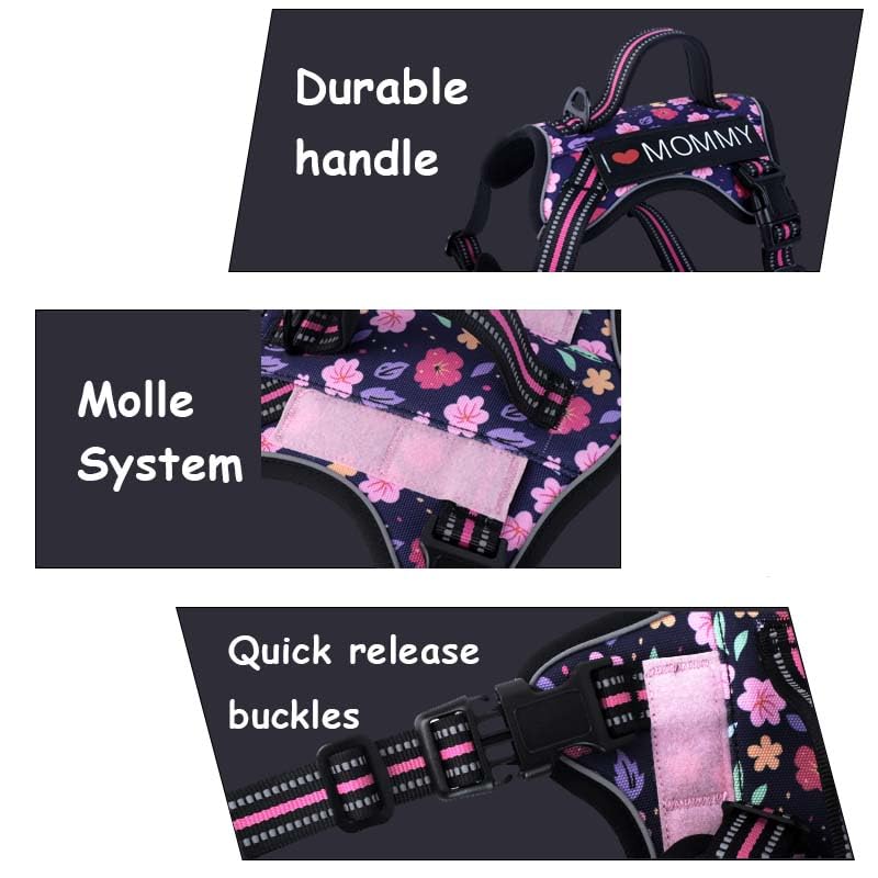 Foxyep Tactical Dog Harness,Working Dog MOLLE Vest with Handle for Medium Dogs No Pull Adjustable Pet Harness Reflective Strapwith Dog Leash Set(M,Blue Floral)