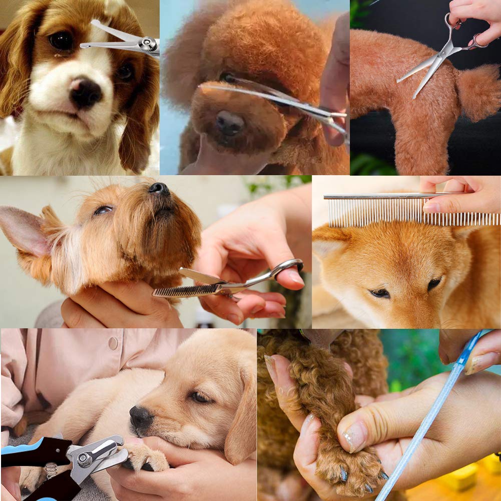 • SAFE: All the pet grooming scissors have a unique round tip top which allows you to trim your pets safely without worrying about hurting them, especially in sensitive areas such as the eyes, ears and feet. The dog nail trimmer has a protective guard to shield your dog’s nail from 'over-trimming'.