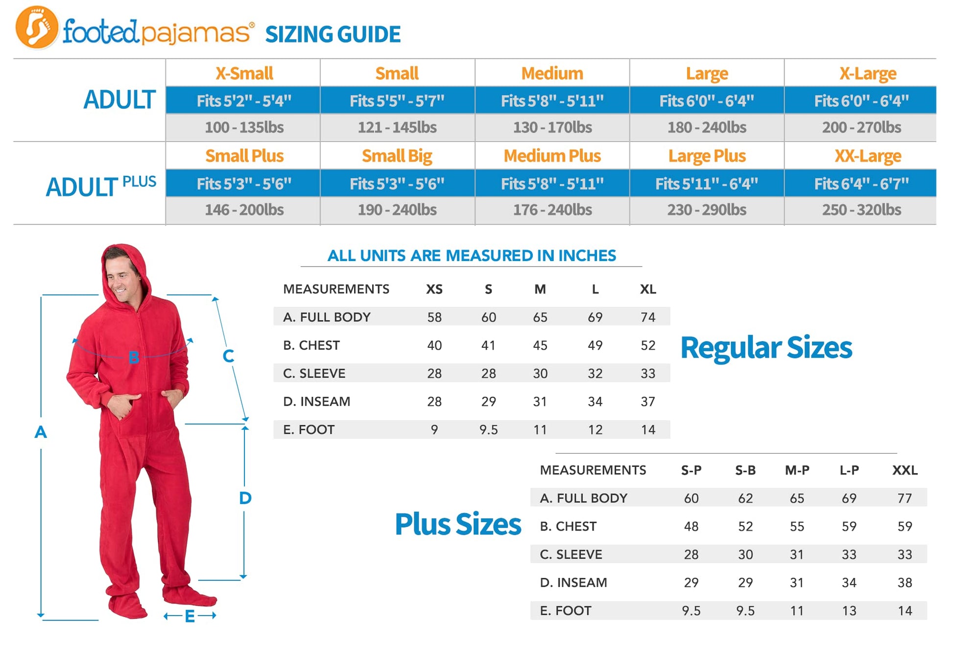 MATCHING SIZES FOR EVERYONE: ***Please review unisex Adult size chart in 'Product Description' below. These mens and womens hoodie footie pj onesies are for everyone! Mom, dad, infants, kids, couples, and friends can all find a matching pair and will love this one-piece suit! Size inclusive: Regular Adult Sizes (XS-XL) as well as Plus/Wide options (Small Plus, Small 2X, Medium Plus, Large Plus, XXLarge). Detailed measurements in gallery images.