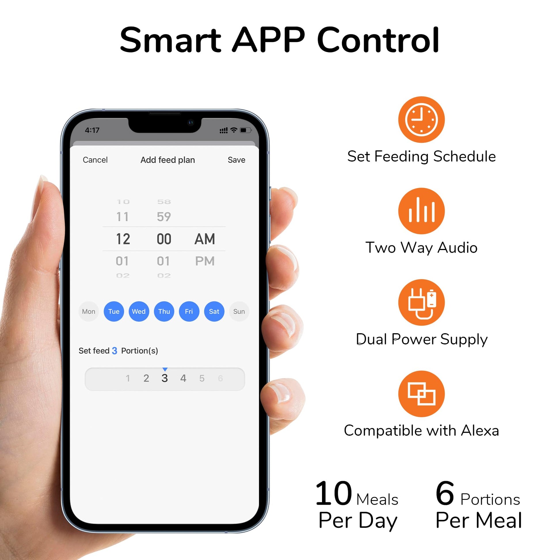 • Smart APP Control - FUKUMARU pet feeder supports 2.4GHz WiFi, allowing you to program and monitor your pet's diet anytime, anywhere through the Smartlife APP for iOS and Android phones. You can set up a feeding plan and time for your pet, with a maximum of 10 meals per day, with 1-6 portions per meal and approximately 1/12cup per portion. (Double press the button on feeder to manually feed one portion food)