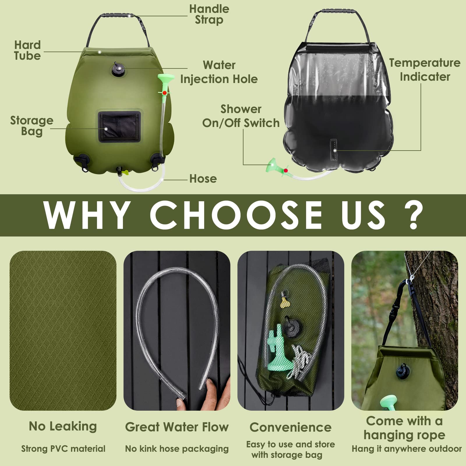 • ✅Eco friendly solar shower bag -Using the power of the sun to heat the large 5-gallon bag, you'll have enough water for multiple showers. Large Capacity: Holds up to 5 gallons, enough for 2 or 3 showers. Place the backside of the bag under direct sunlight to heat the water to 113°F (45°C) in few hours. Great for beach, camping outdoor showers and washing hands or dishes.