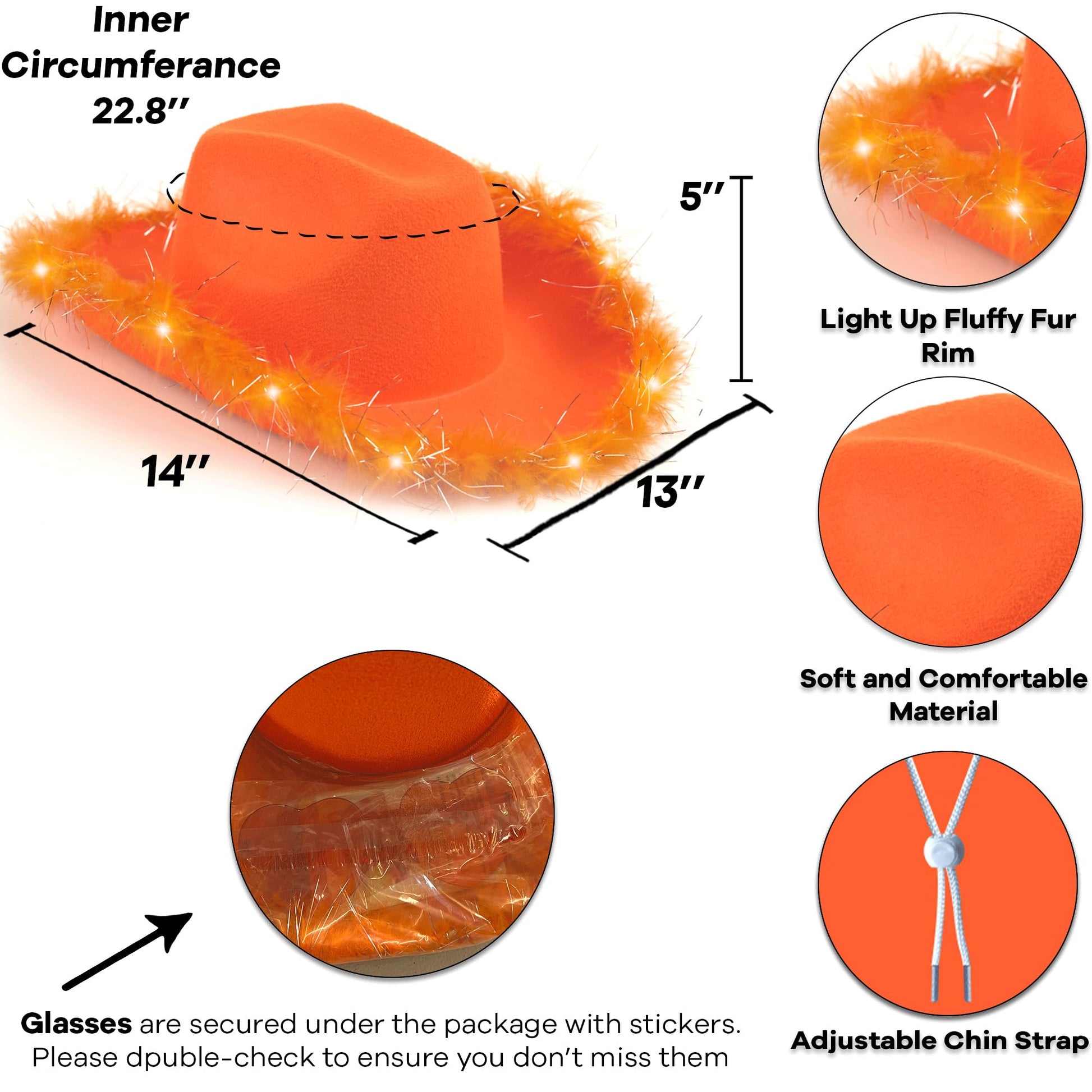 Funcredible Orange Cowboy Hat and Glasses - Light Up Cowgirl Hat for Girls - Cowboy Hats with Feathers - Halloween Hats for Women