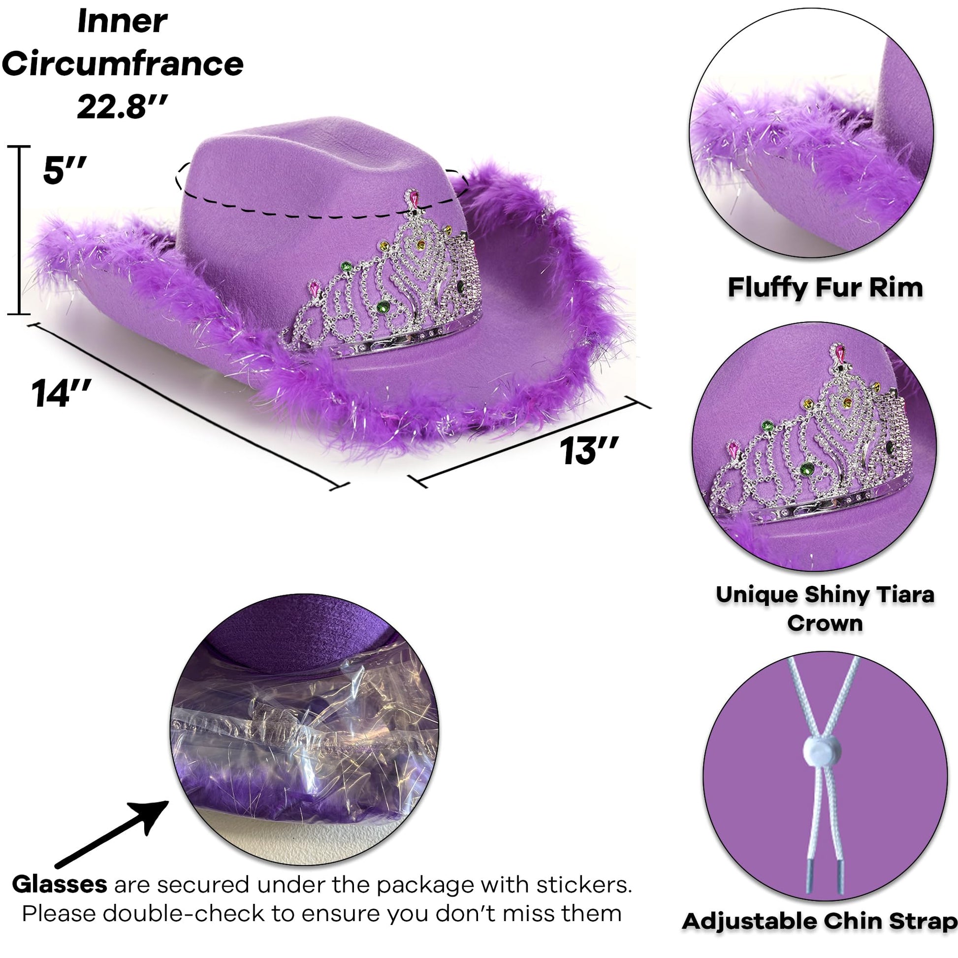 Funcredible Purple Cowboy Hat and Glasses - Preppy Cowgirl Hat with Tiara - Cowboy Hats with Feathers - Hannah Costume - Cowgirl Costume Accessories for Women and Girls