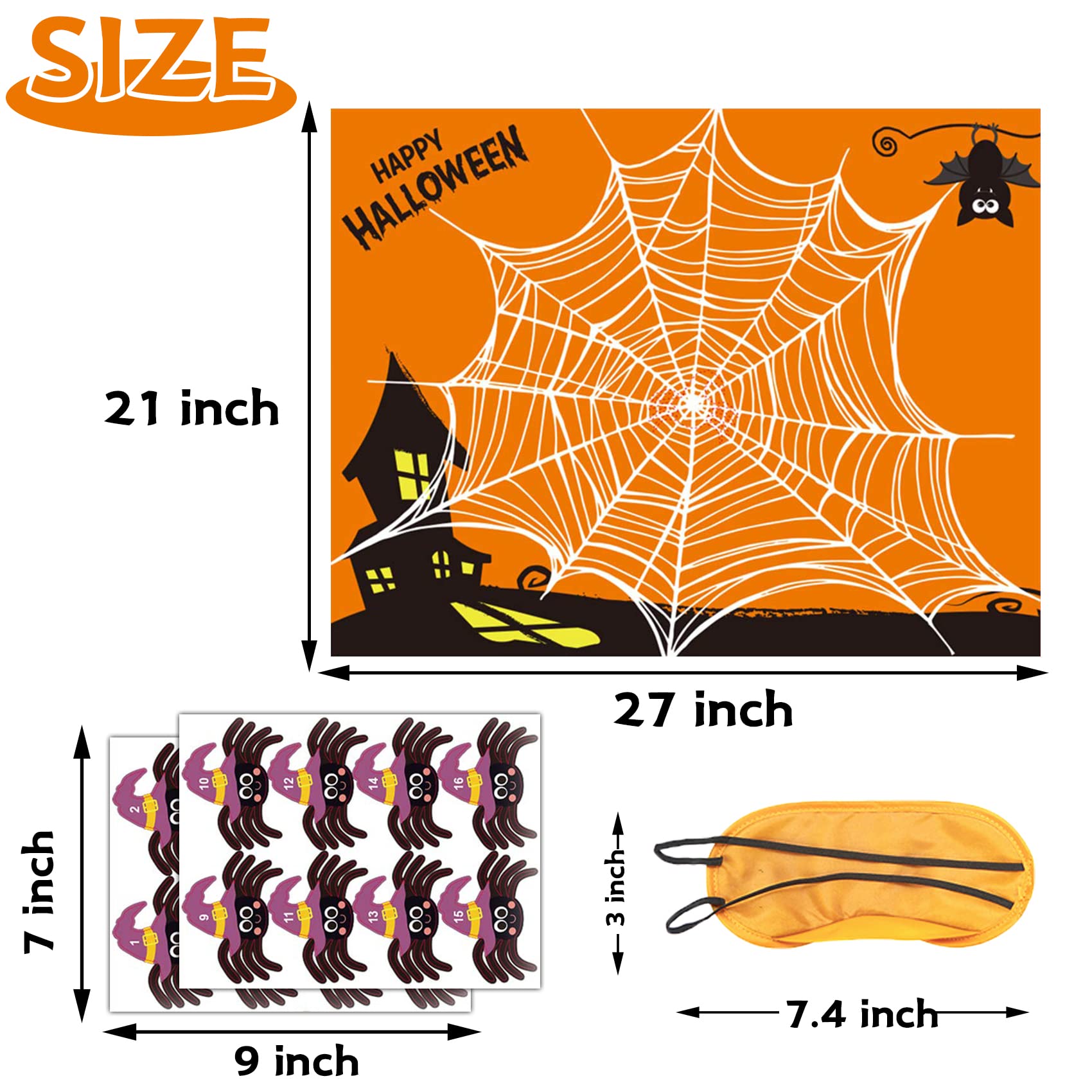 • EASY TO PLAY: First, marking a line on the ground as the staring line. Second, kids select one lucky number from 16 pcs Halloween spiders, Third, wear the eye mask, Forth,try to pin the spider on the web, Final, the closest one win the game.Nicehalloween kid party games