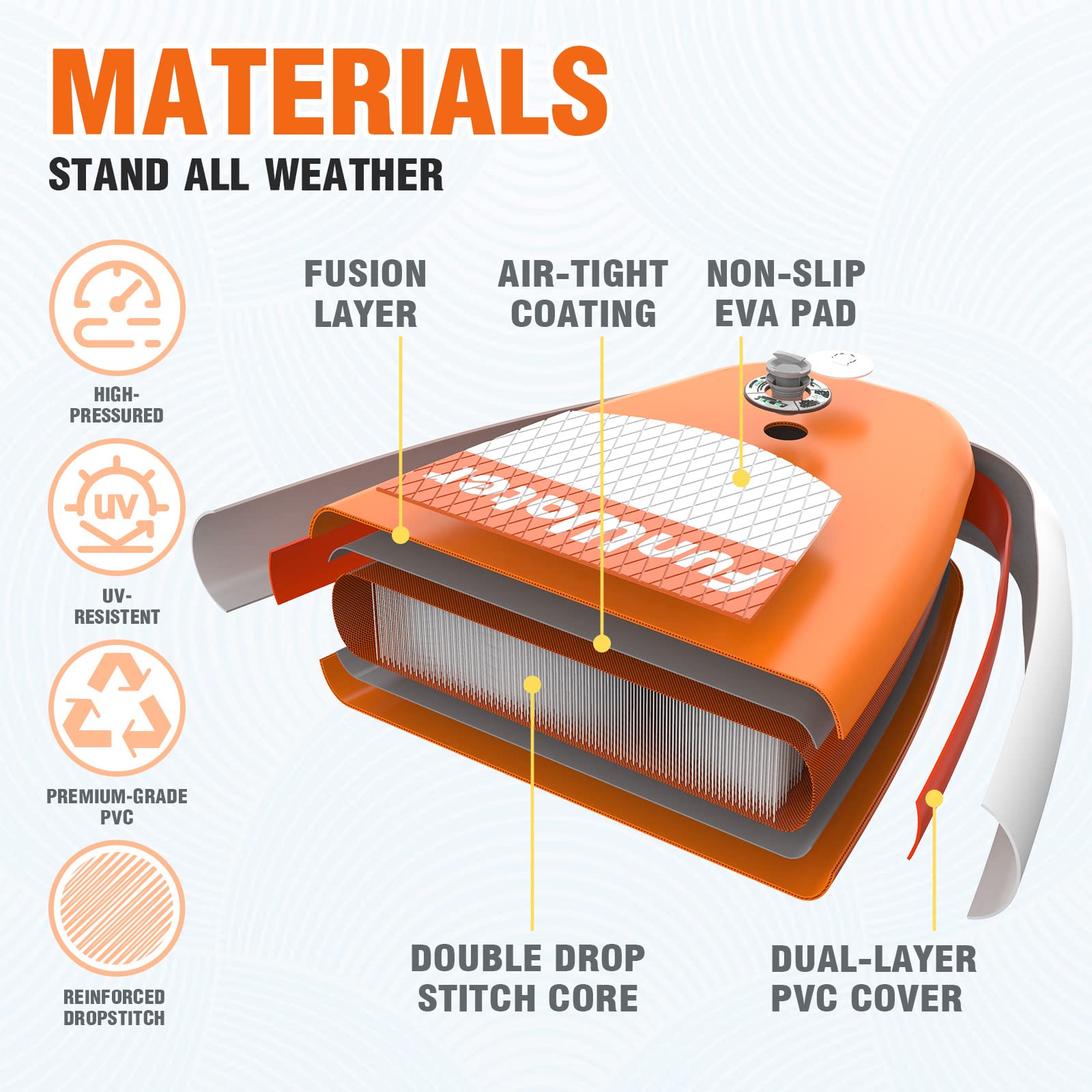 • 【Materials and Parameters】The new ultra light military grade double wall PVC is 35% lighter than similar size products (17 pounds), with excellent wear resistance, toughness and long service life. The inflatable paddleboards standard size is 10'× 31' × 6 ', carrying 300 pounds.