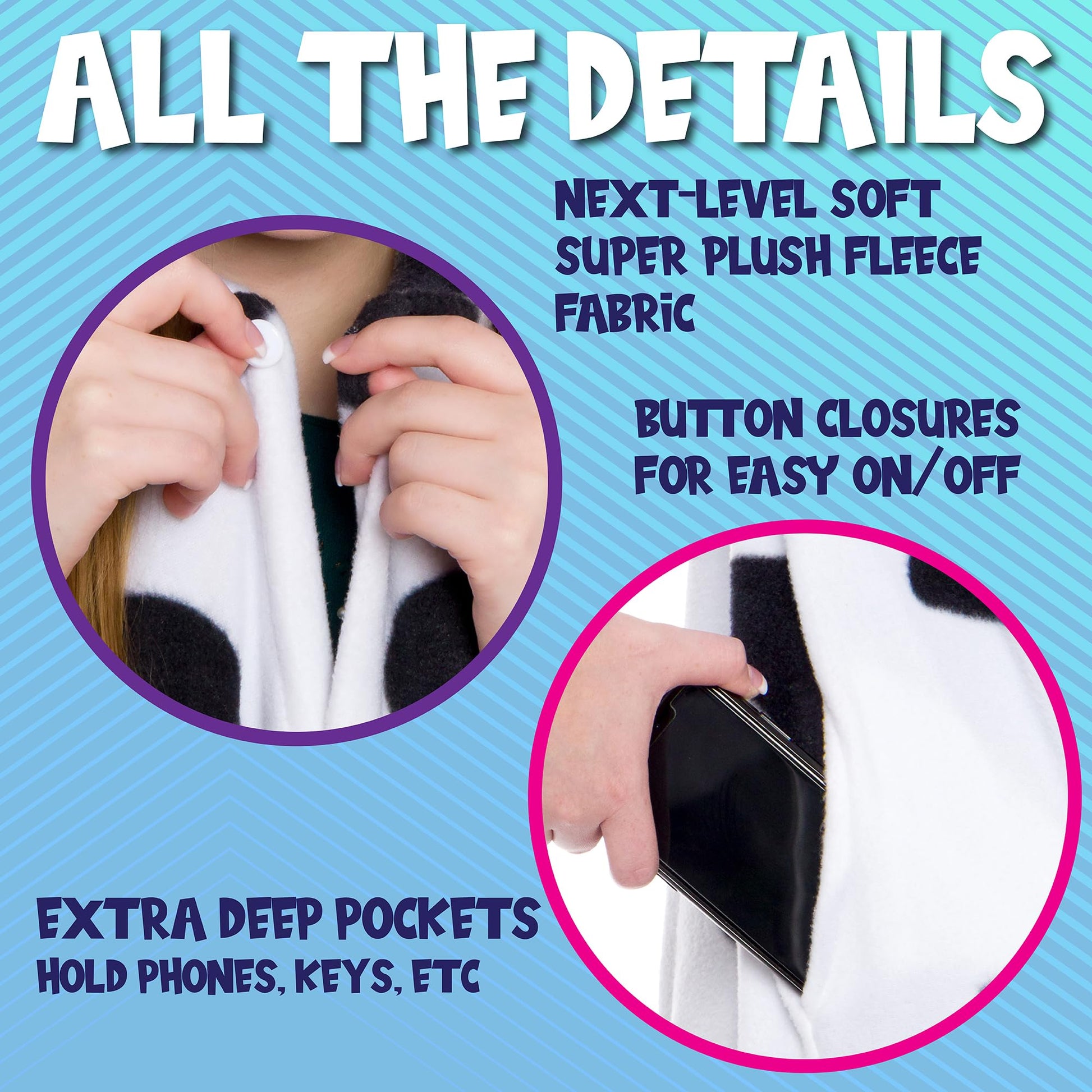 • COZY - A special blend of comfort and fun, these plush materials are soft to the touch and will keep you warm during those cold winter months. The button up suit closure allows you to quickly get dressed while the loose fit gives you the flexibility to easily wear over your existing clothes or jacket.