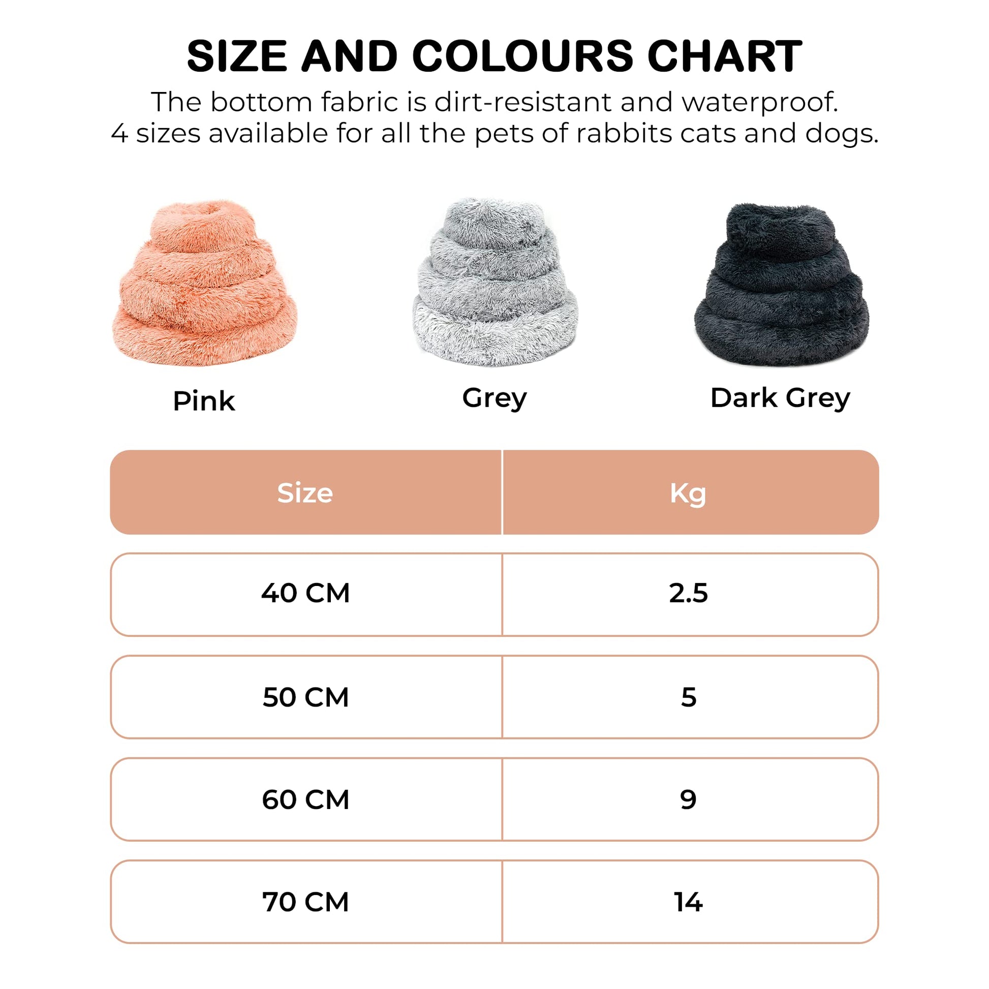 • πŸ’ π’πˆπ™π„π’ π“πŽ π‚π‡πŽπŽπ’π„ π…π‘πŽπŒ: 4 sizes available for all the pets of rabbits cats and dogs. 40CM is suitable for small dogs or cats or rabbits up to up to 2.5kg, 50 CM is suitable for small to medium dogs up to 5kg, 60CM is suitable for dog bed medium up to 9kg, 70 CM is suitable for pets up to 14kg.