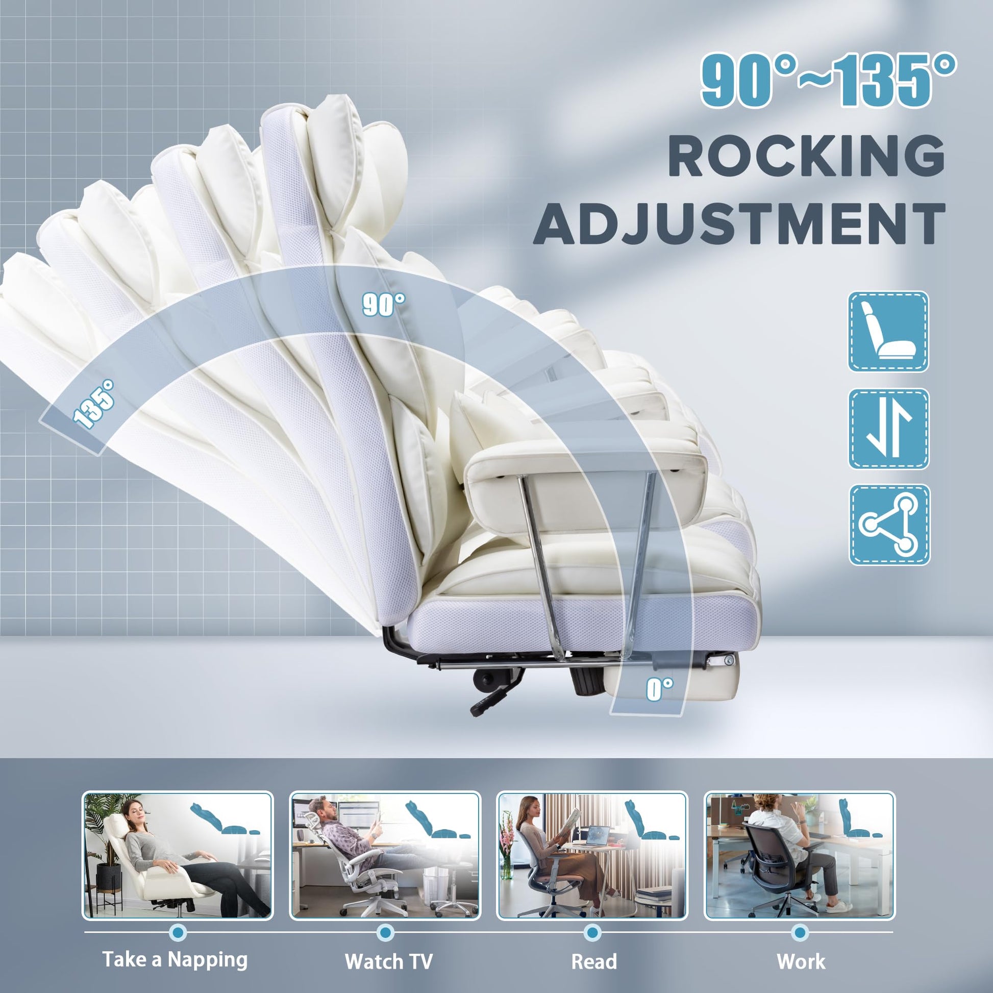 • Adjustable Office Chair: This leather office chair with footrest offers a variety of adjustable features, including seat height, tilt angle adjustment, 360° swivel, and smooth glide, allowing you to find the perfect sitting position for your individual needs. With a maximum tilt angle of 135°, this reclining office chair provides exceptional comfort and flexibility, making it ideal for your home office.