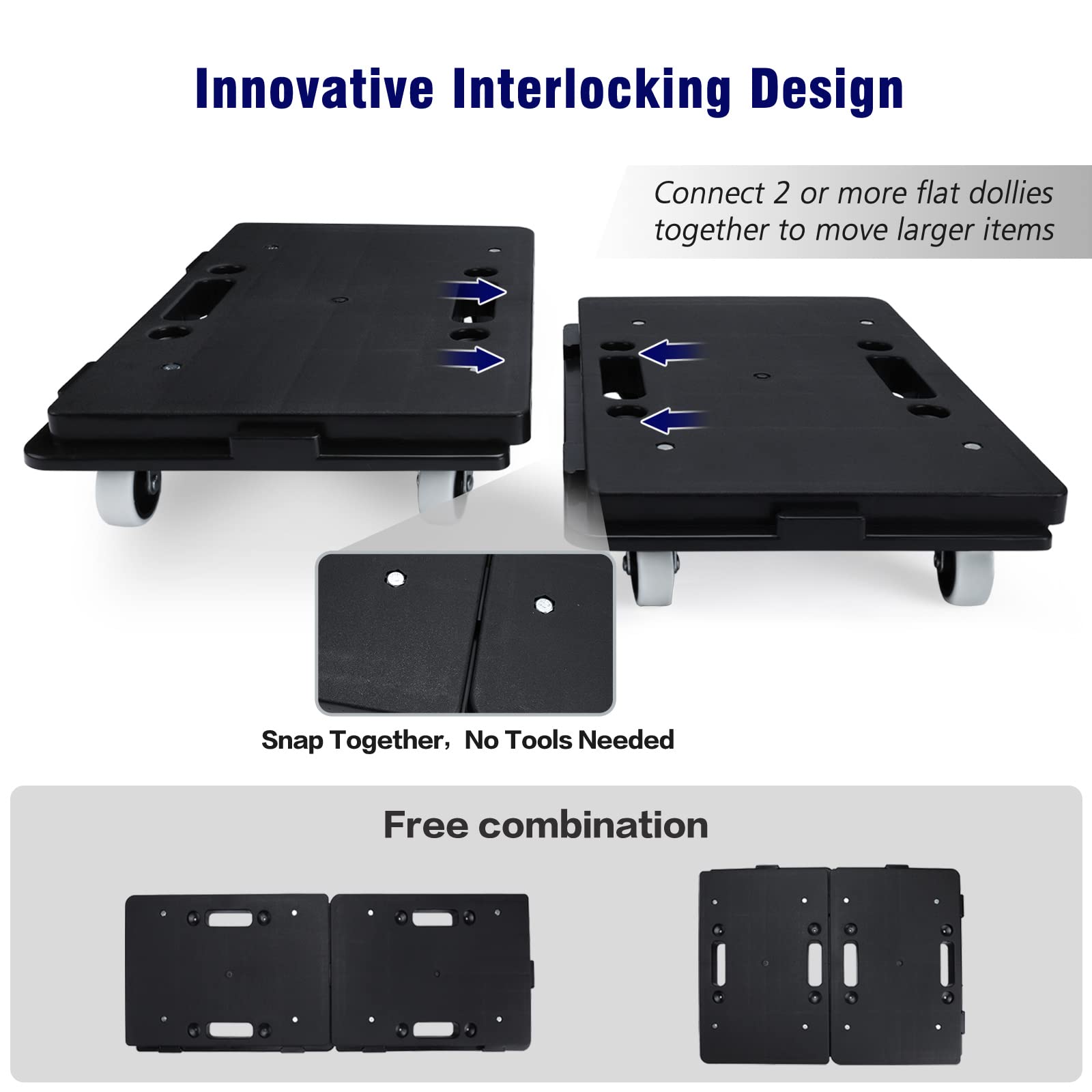 • [Innovative Interlocking Design]: You can connect two or more flat dollies together to move larger items just snap the two together, no tools or hardware needed.