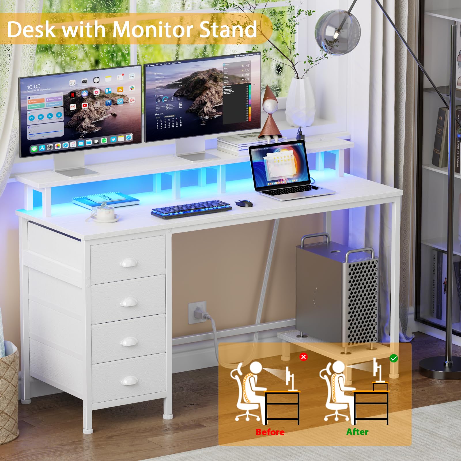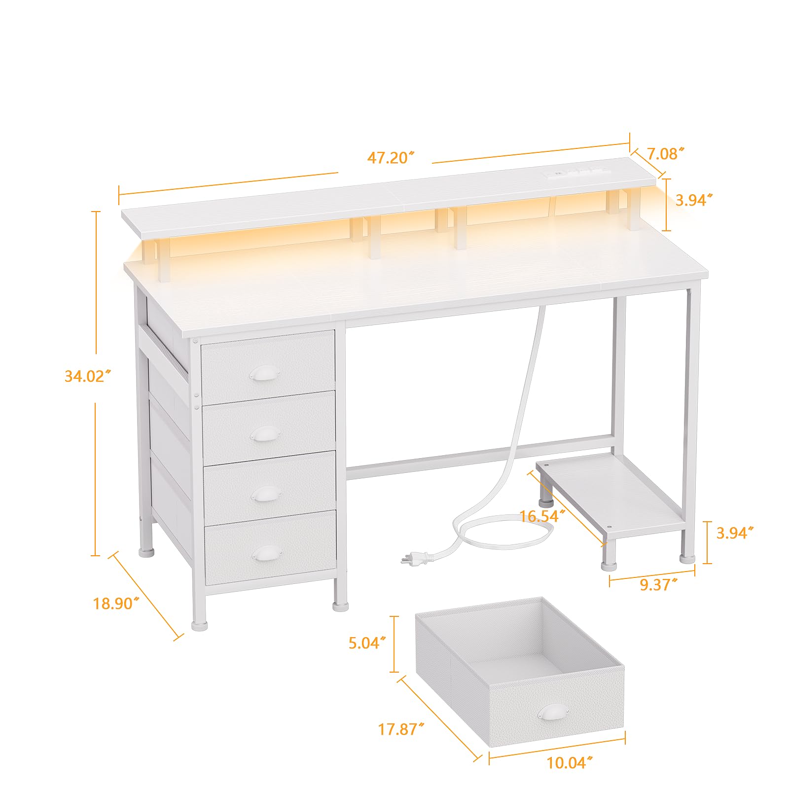 Furologee 47 Inch Computer Desk Gaming with 4 Fabric Drawers with Power Outlets and LED Lights for Home Office with Full Monitor Stand and Shelf Study Table for Small Spaces White