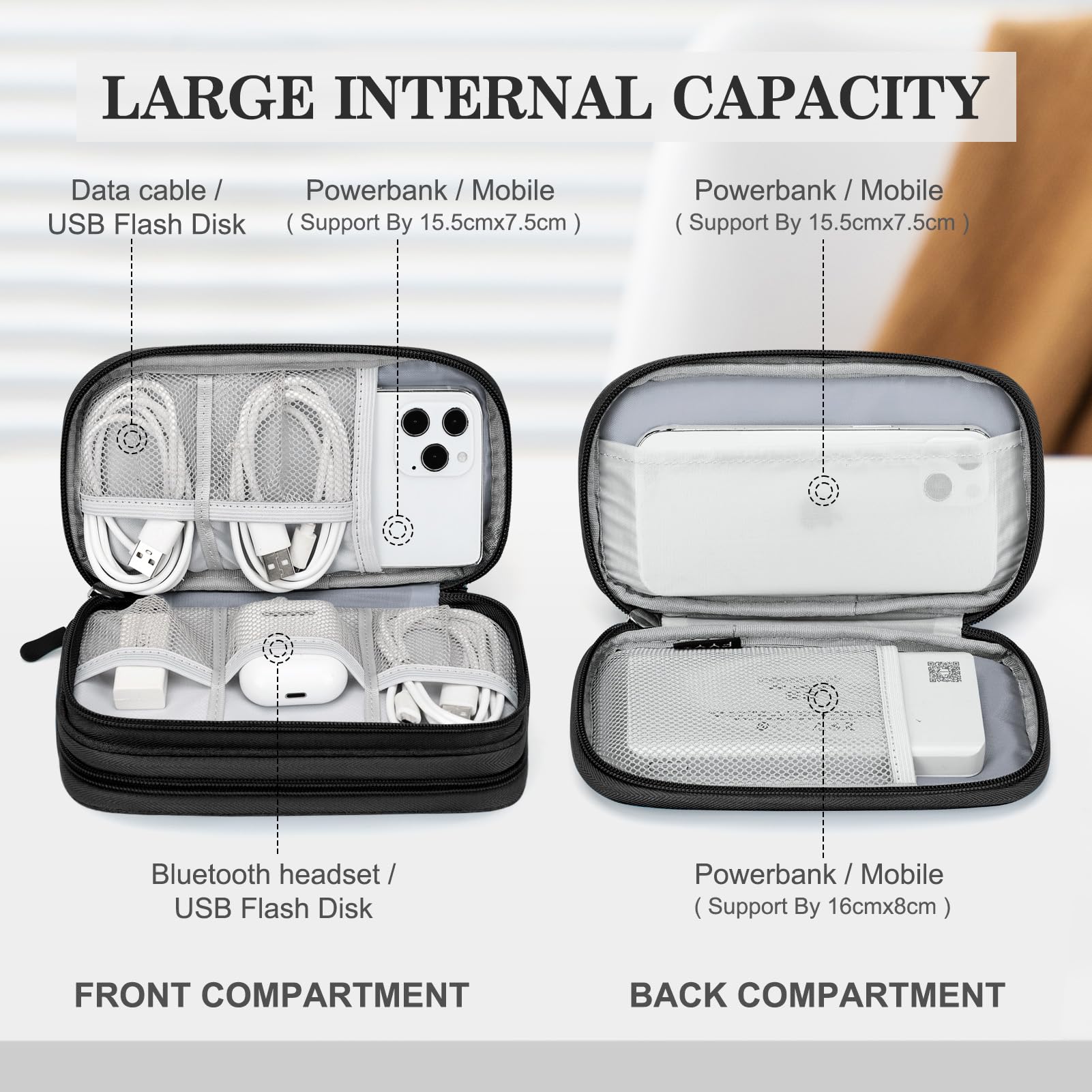 • Double Layers Design: The electronics storage bag has 2 layers interior compartment with enough space to take in your cords, cables, USB drive, cellphone, charger, mouse, flash drive, and other accessories.