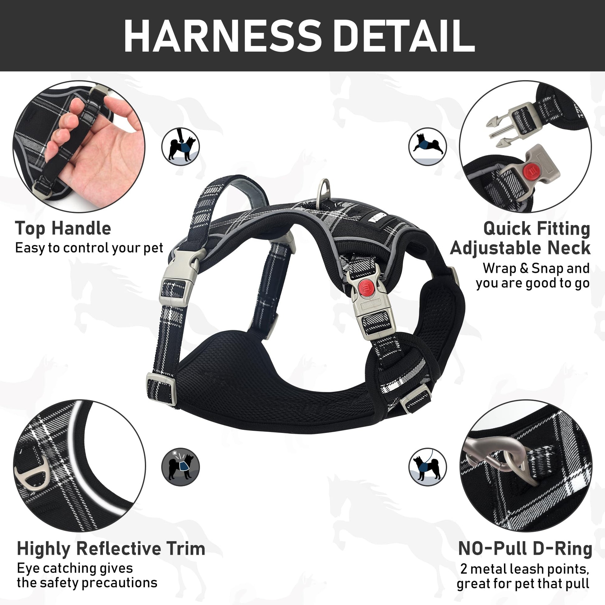 • NO PULL, NO CHOKE: This no pull pet harness is specially designed with 2 metal leash attachments. This pet harness equipped with 3 quick release snap buckles at neck and chest, making it much easier to put on and remove. The front D-ring is to stop your pet from pulling on walks, it is also good for dog training. The back D-ring is ideal for casual walks, jogging, its vest-like design distributes the pressure of the leash evenly across the chest and shoulders to prevent choking or neck strain.