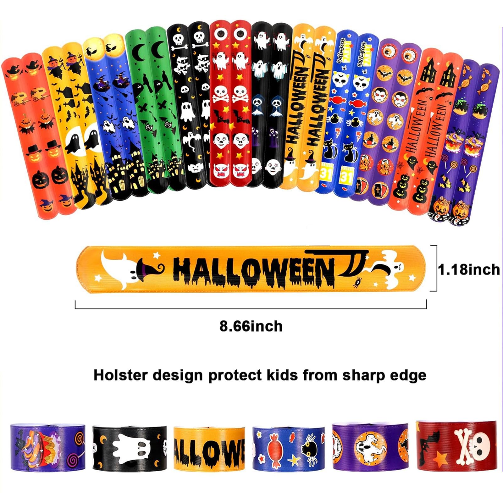 • Package includes: A total of 48 multi-Halloween wristbands. 12 Halloween style rubber wristbands are designed with 2 pieces each and 12 Halloween style Slap bracelets are designed with 2 pieces each. Brightly colored, it's perfect for Halloween party favors, prizes for kids' classes, and stuffing.