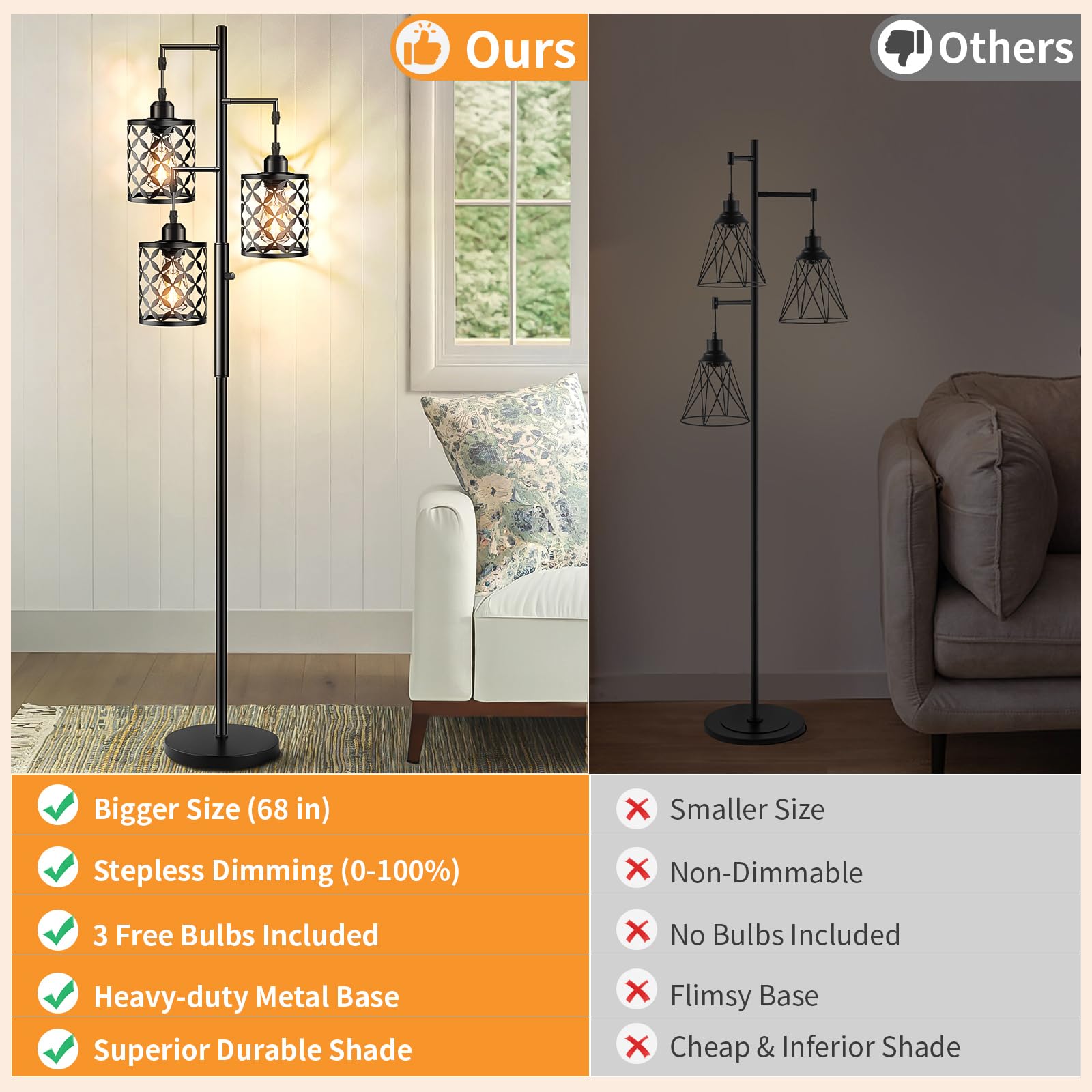 GHOOCEMLUX 68" Dimmable Floor Lamp, Farmhouse Standing Lamp with Elegant Metal Cage, Industrial Tall Tree Floor Lamps for Living Room, Bedroom, Study Room, Office (2000LM LED Bulbs Included) - Black