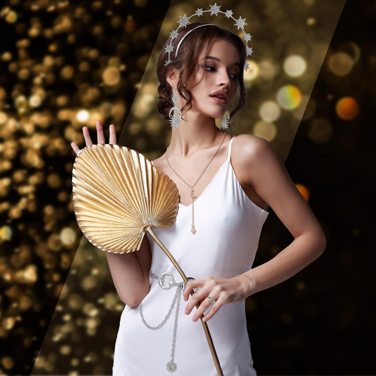 • Elegant Jewelry Set: the package contains 1 piece of crown, 1 pair of moon and star earrings, 1 piece of necklace and 1 piece of waist chain, 1 piece of ring and 1 piece of silver bracelet, enough to meet your daily dress needs, you can also share them with your friends and family members