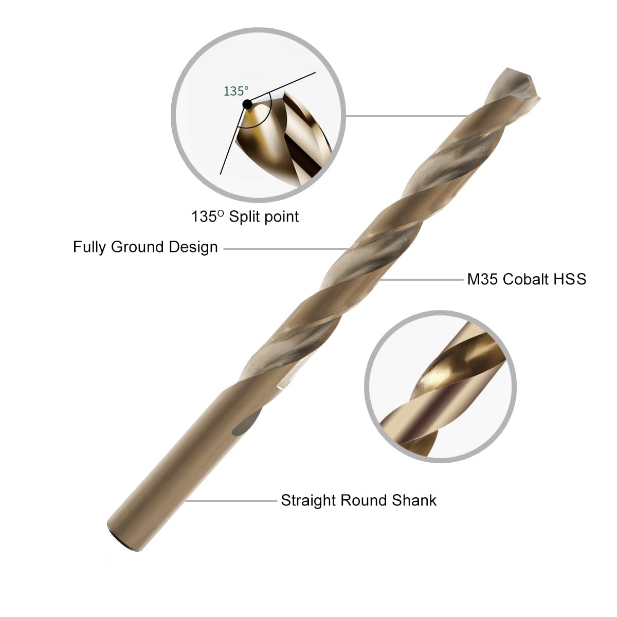 GMTOOLS 15Pcs Cobalt Drill Bit Set, M35 HSS, 135 Degree Tip, Twist Jobber Length Drill Bit Kit for Hardened Metal, Cast Iron, Stainless Steel, Plastic and Wood, with Indexed Storage Case 1/16"-3/8"