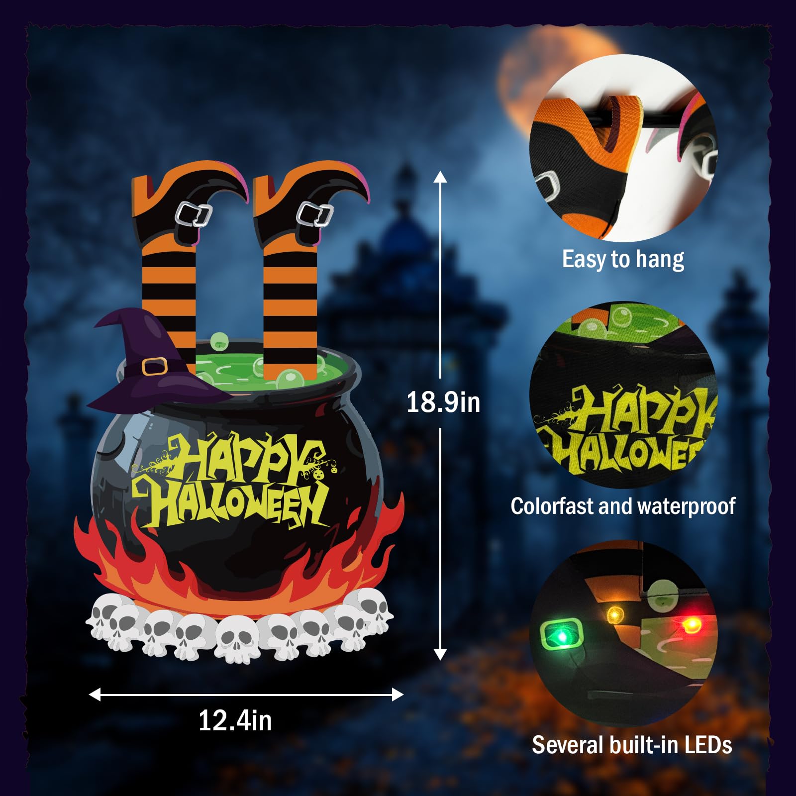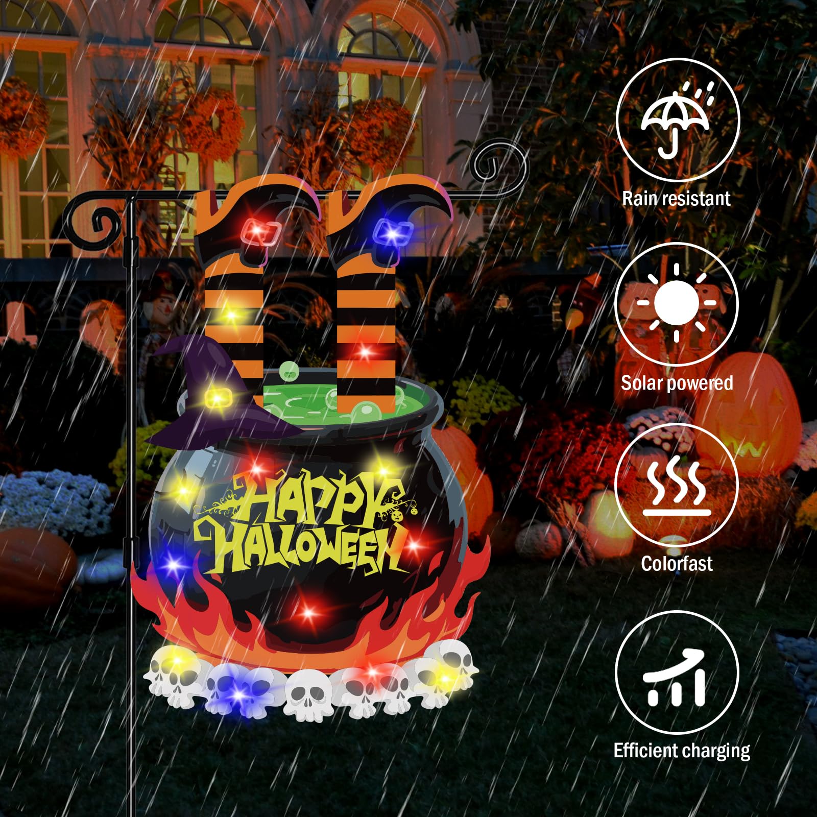 GOAUS Halloween LED Garden Flag Light Up Solar Powered, Witch Cauldron Decorations Outdoor, Double Sided Oxford Decorative Flag for Lawn Yard Outside Decor, 12x18 Inches