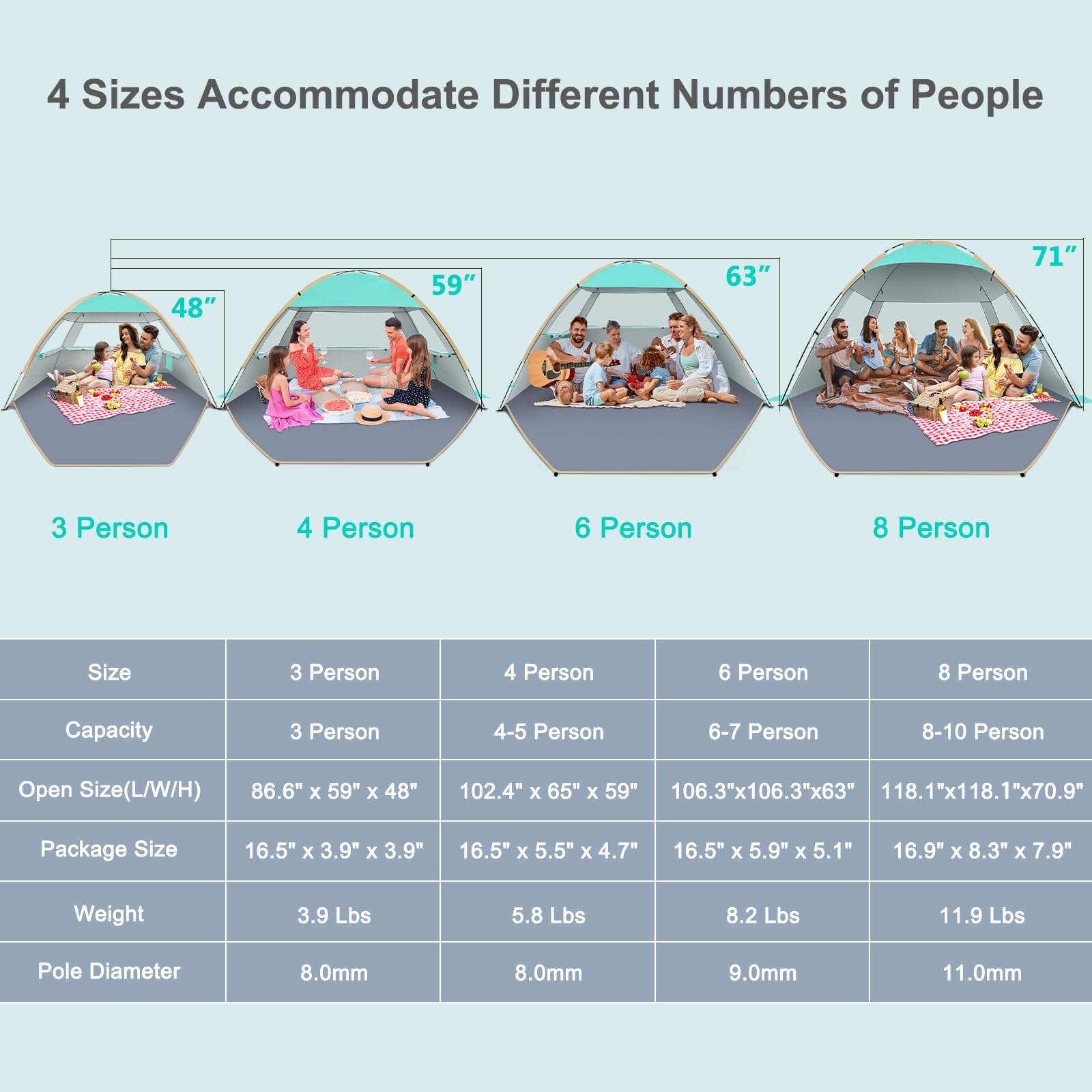• Super Large Space: Size of 86.6'L x 59'W x 48'H, 30% bigger than other POP-UP tent at similar price, fits 3-4 person. It provides a comfortable space for family and friends on the beach
