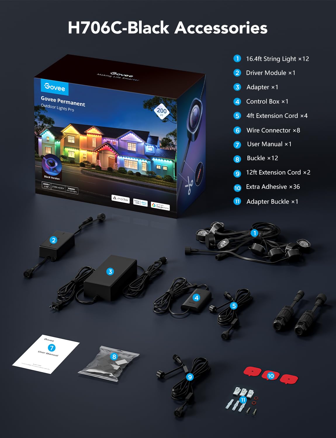 • Smart App & Voice Control: Pair DIY permanent lights with Matter, Alexa, and Google Assistant for smart voice control. Use Govee Home App to individually control the color of each Govee light for outdoor decorations